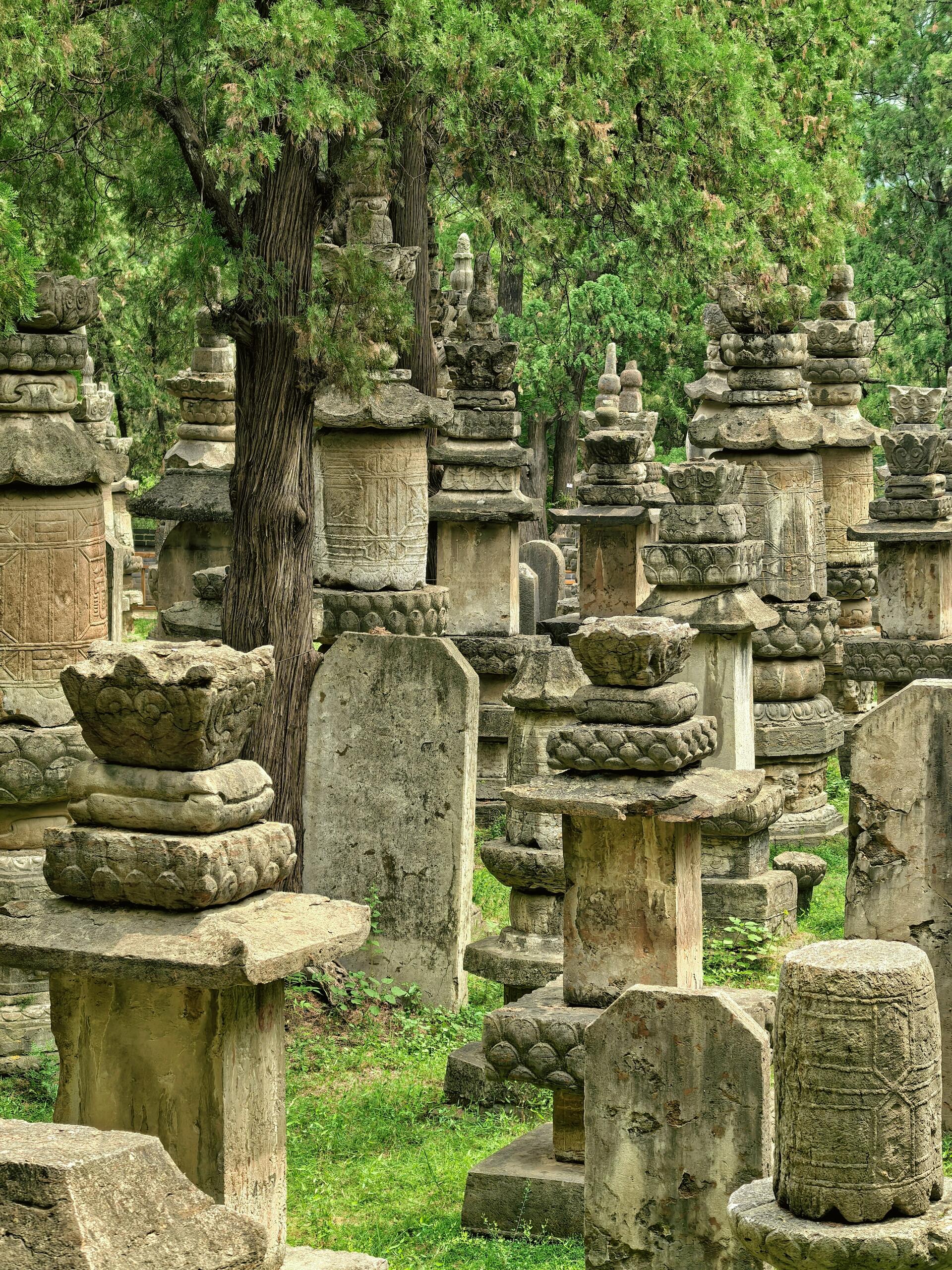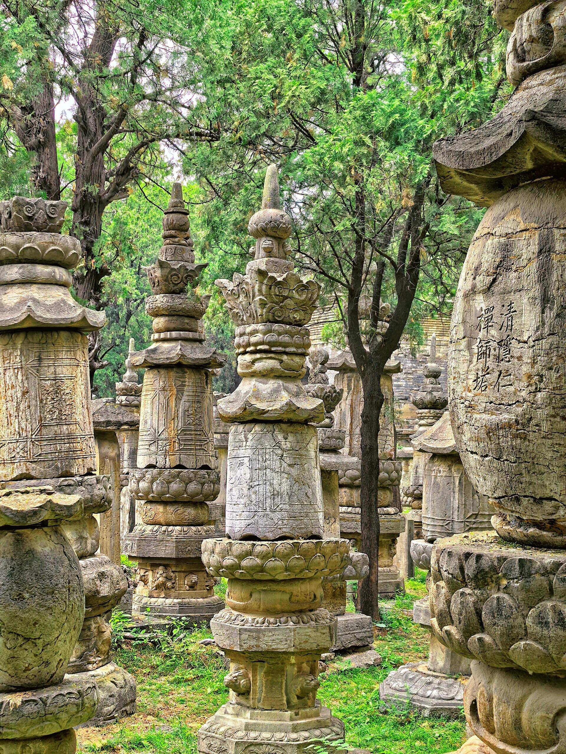 沿着蜿蜒的小径往深处走,一片密密麻麻的塔林突然出现在眼前。167座墓塔高低错落,从唐代到清代,每一座都刻着不同的故事。慧崇塔是其中最耀眼的存在,方形塔身四面雕刻着火焰纹假门,门侧的金刚力士怒目圆睁,肌肉的线条仿佛能让人感受到紧绷的力量。唐代的飞天浮雕轻盈灵动,衣带翻飞间似有仙乐飘飘;元代的塔座上,力士们袒胸露腹,青筋暴起,仿佛正用肩膀扛起信仰的重量。在这里漫步,脚下的每一块石板都是一部佛教史,每一道裂痕都是岁月的批注。