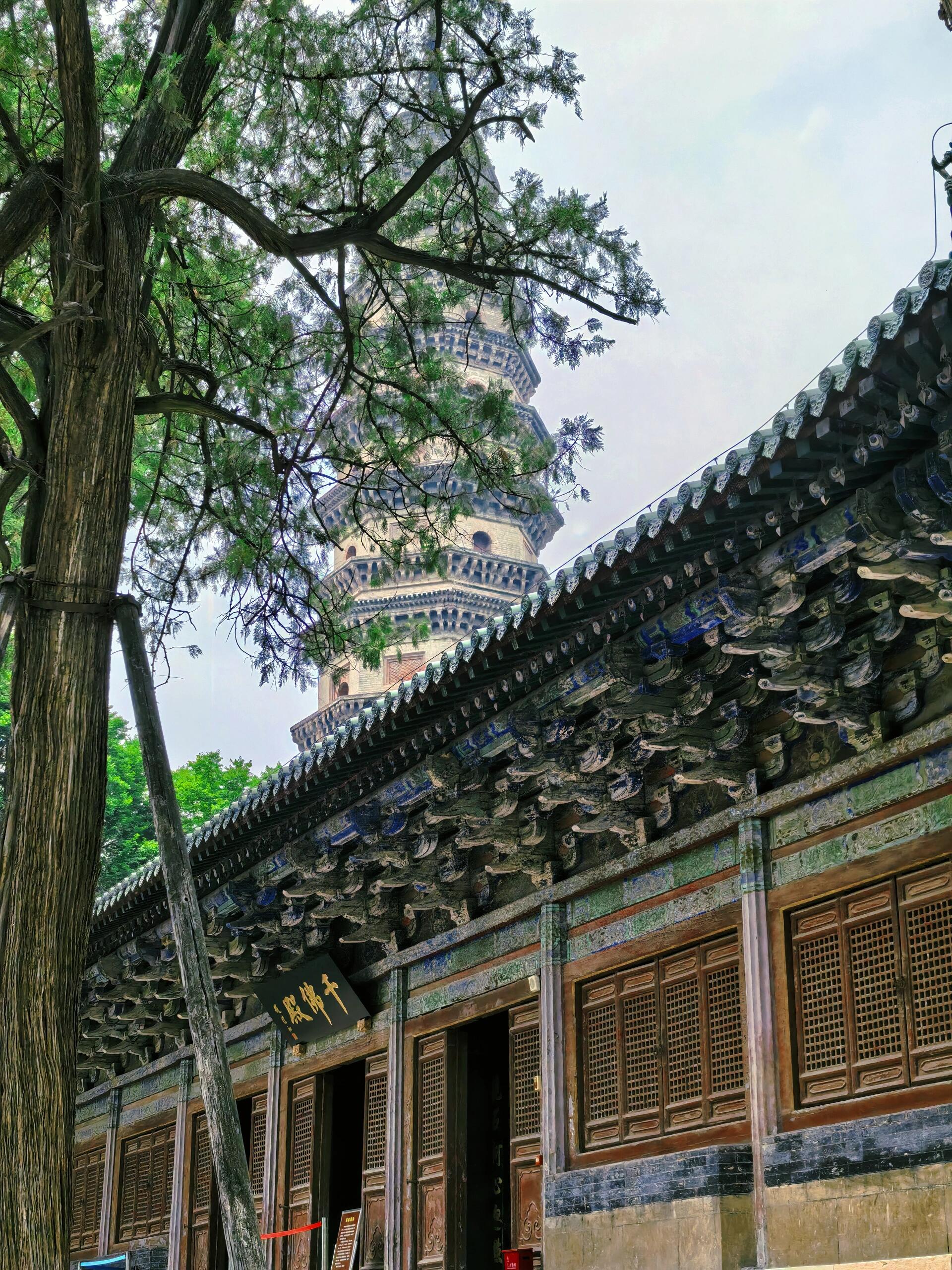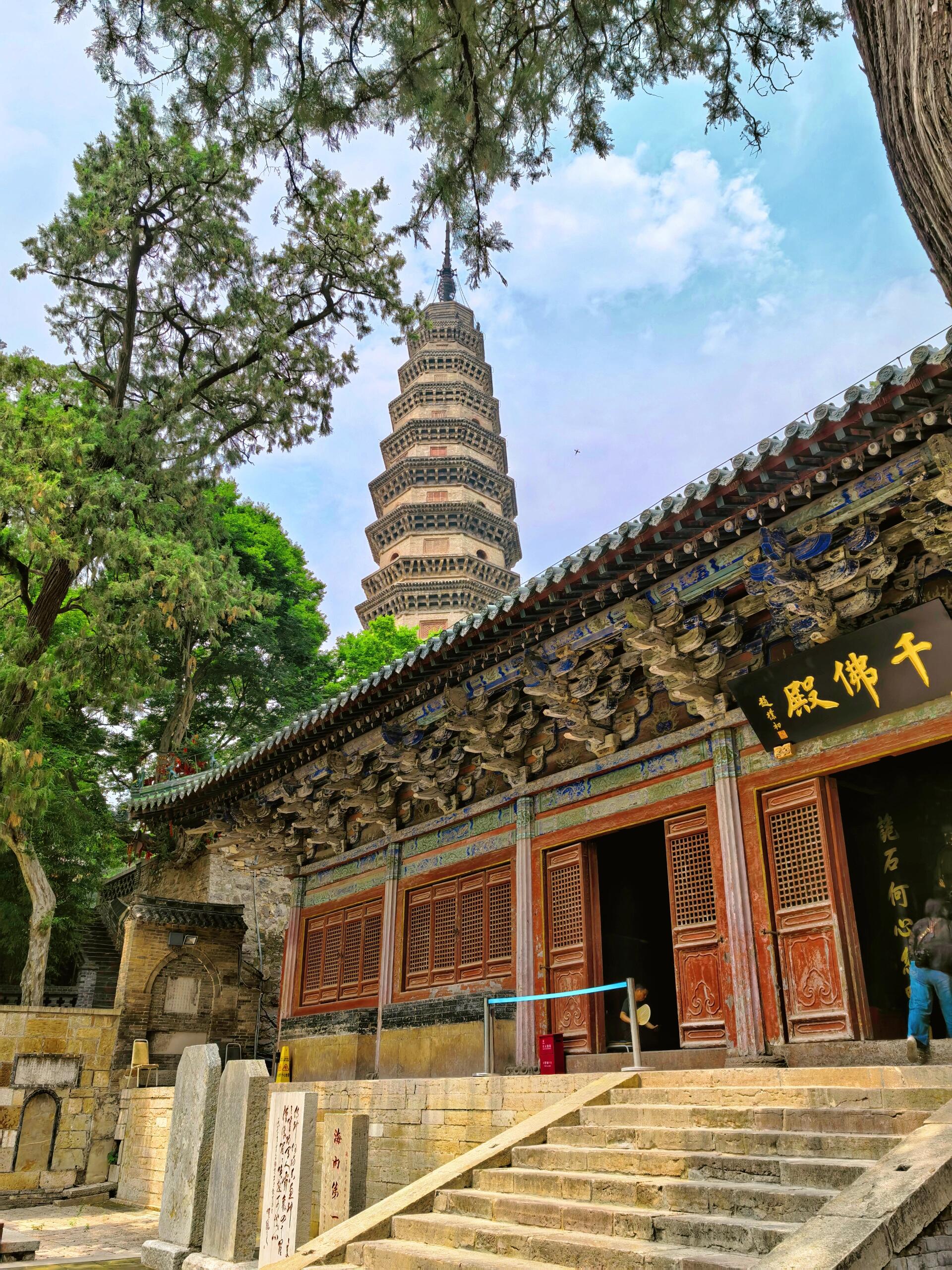 出千佛殿向东,辟支塔如同一支巨笔直插云霄。这座历经63年建成的北宋佛塔,是中国楼阁式塔的典范。8角9层的塔身,每一层都有迥然不同的风景:底层的浮雕讲述着阿育王的故事,武士的盔甲纹路清晰可辨,战马的鬃毛仿佛在风中飘动;往上走,斗拱的形制逐渐变化,到了顶层,檐角的铜铃虽已锈迹斑斑,却依然能在风起时奏出清远的音调。登塔的阶梯狭窄陡峭,每一步都像是在与历史对话,当你终于站在塔顶俯瞰,群山如浪,古寺如舟,刹那间便懂得了古人“欲穷千里目”的心境。