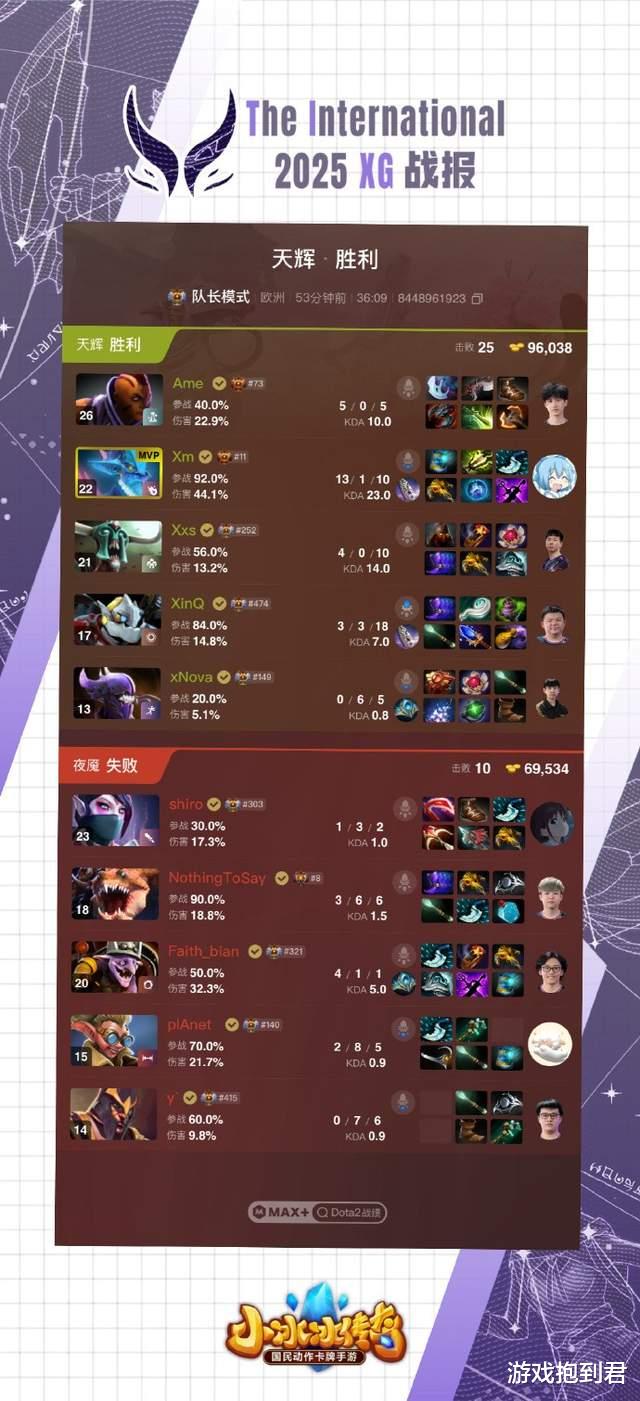 在3-0组的晋级战中,XG与Tidebound上演了一场堪称教科书级的对决。首局,XG凭借XinQ的几波中路游走,为中单老鹿打开了局面,经济领先的老鹿开始无限扫图,配合无解肥敌法一路碾压拿下胜利。次局,Tidebound拿出了人马拉车TA体系,双方一度打的有来有回,甚至让Ame的斯温都不得不出盘子,但在关键几波团战中XG靠着XXS尸王的不停救人和毛帕的无限游龙再次拿下,成为首个晋级线下八强场馆赛的队伍。