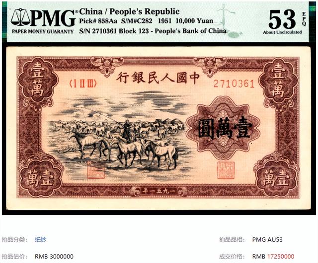 比如一万比一进行兑换的一版币,一张面值1万元的牧马图,仅仅只能兑换1元而已。但它在拍卖会中,已经能拍出1725万了。