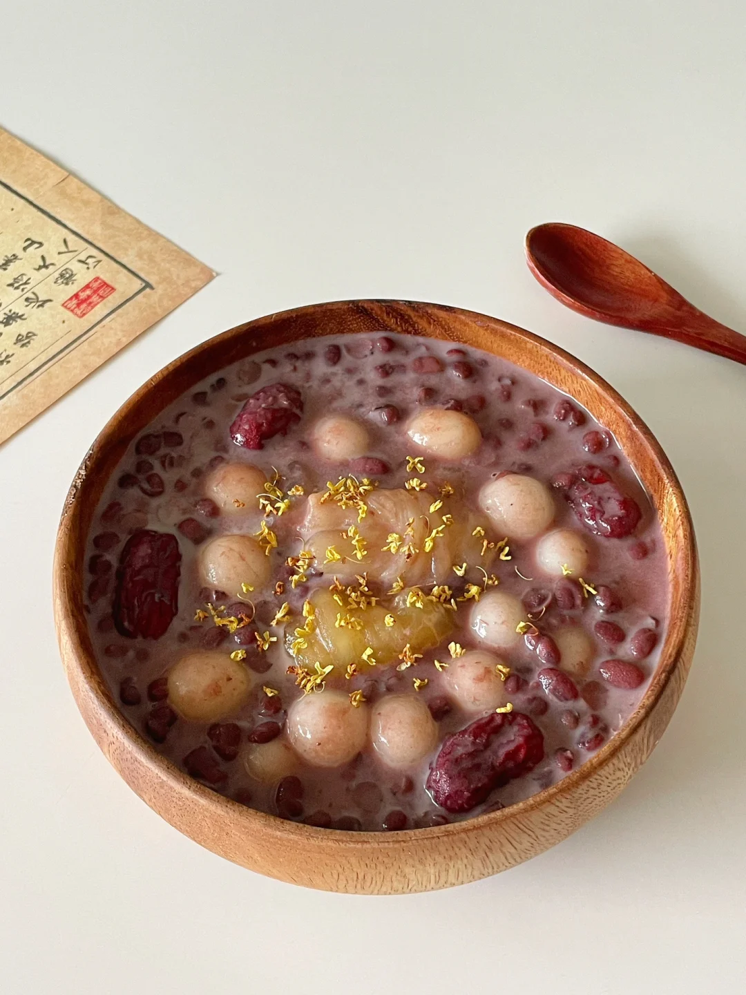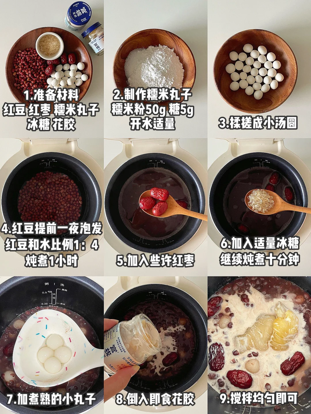 1⃣️红豆提前泡一夜,红豆与水比例1:4炖煮一小时,加入些许红枣和冰糖搅匀继续煮十分钟。