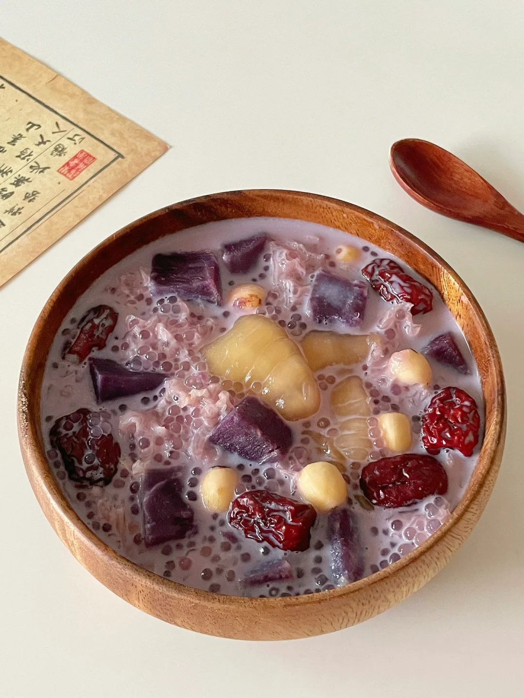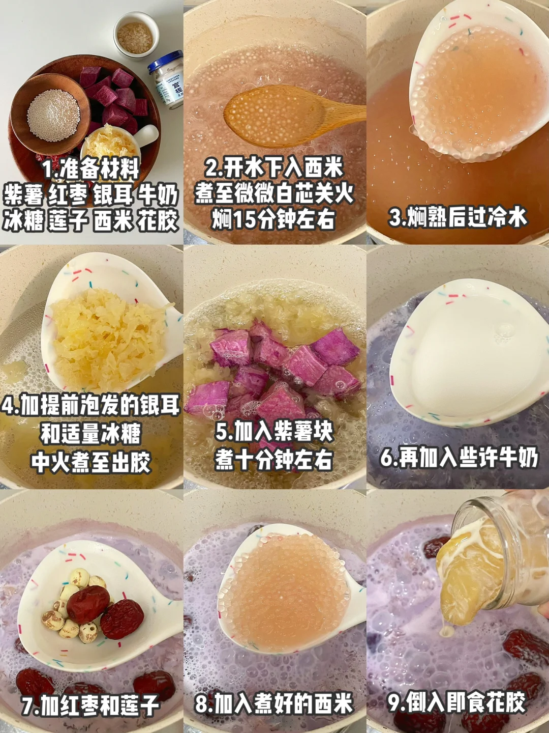 2⃣️银耳提前泡发,撕碎后加入热水中再加适量冰糖熬制出胶,再下入紫薯煮十分钟。