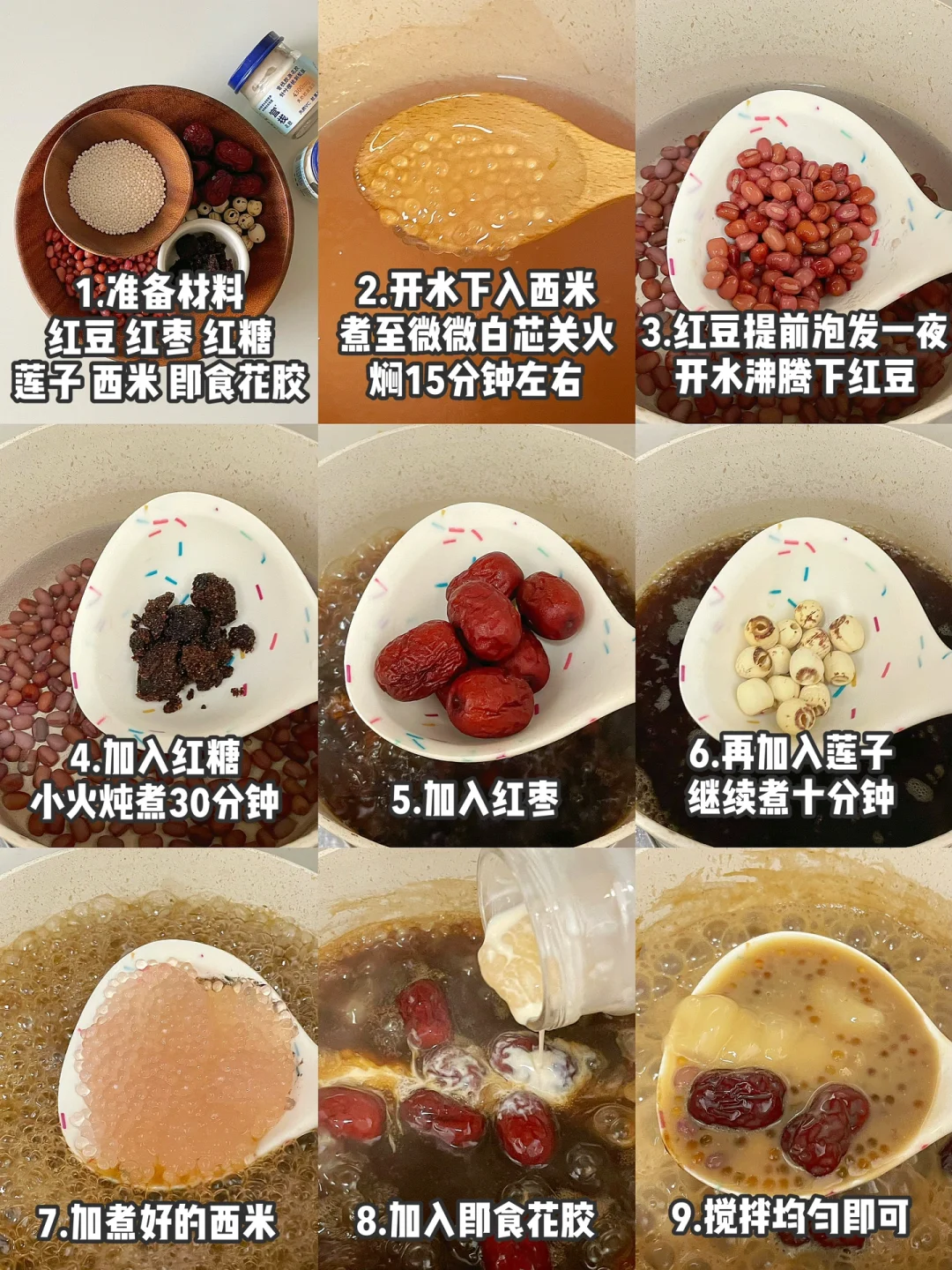 1⃣️西米提前煮熟过冷水备用,红豆提前泡发一夜,加入热水中和红糖一起煮半个小时以上。