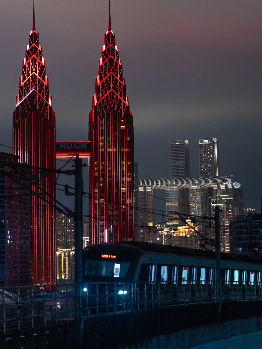 3️⃣海棠溪站:夜晚的海棠溪轻轨站可以看到远处的三对重庆双子塔地标建筑,时而有列车呼啸着从身旁疾驰而过,像极了赛博朋克风格的科幻作品中的未来城市;