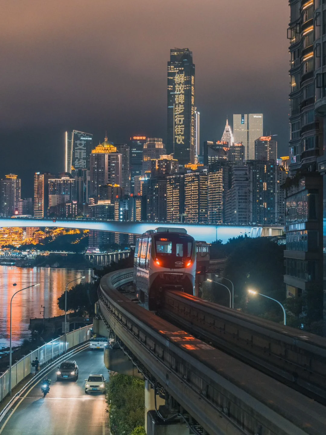 2️⃣洪崖洞:坐轻轨6号线到大剧院站,出站后就是洪崖洞对面,可拍洪崖洞正景,再走上干厮门大桥可近距离拍洪崖洞近景和特写,建议带长焦,没太大必要就不用去洪崖洞下人挤人啦;