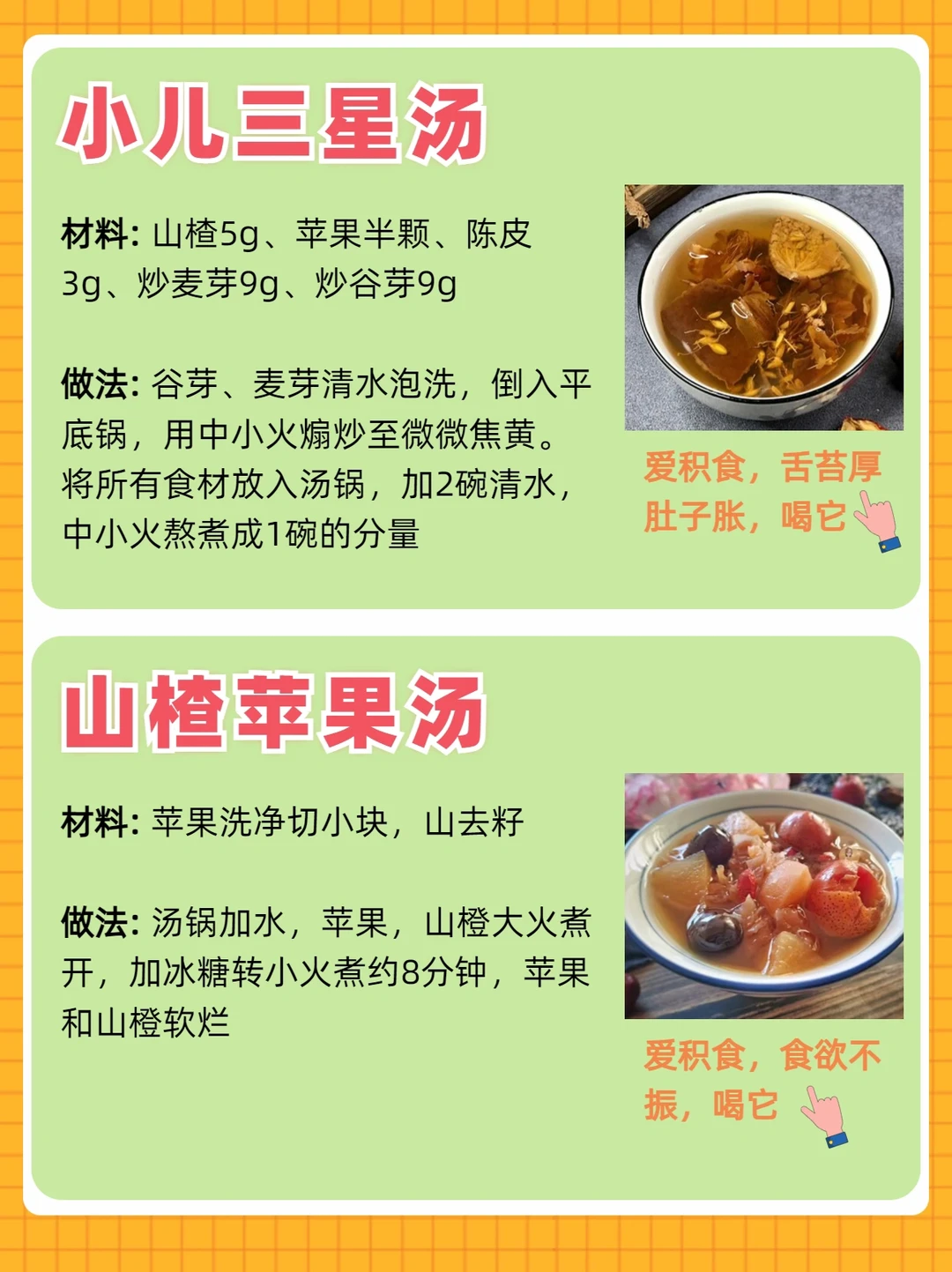 现在天气炎热,夏季孩子也没什么胃口,整理了一些调节宝宝食欲的方法和健脾养胃的营养食谱,还能开胃增加食欲,脾胃调理好了,吃进去的东西才能被身体吸收,身体更棒,长得结实! 1.小儿三星汤:开胃消食,去口气 2.山楂苹果汤:健脾止泻,增强食欲 3.四神排骨汤:增强免疫力,祛湿健脾 4.三味健脾粥:健脾化湿,和中消暑 5.无花果百合汤:助眠安神,清火滋润 6.南瓜红枣粥:和中益胃,促进消化 宝宝消化不太好,容易积食腹胀、食欲不振的,可以试试这些消积解暑汤,促进消化,甜甜的宝宝都挺喜欢的~