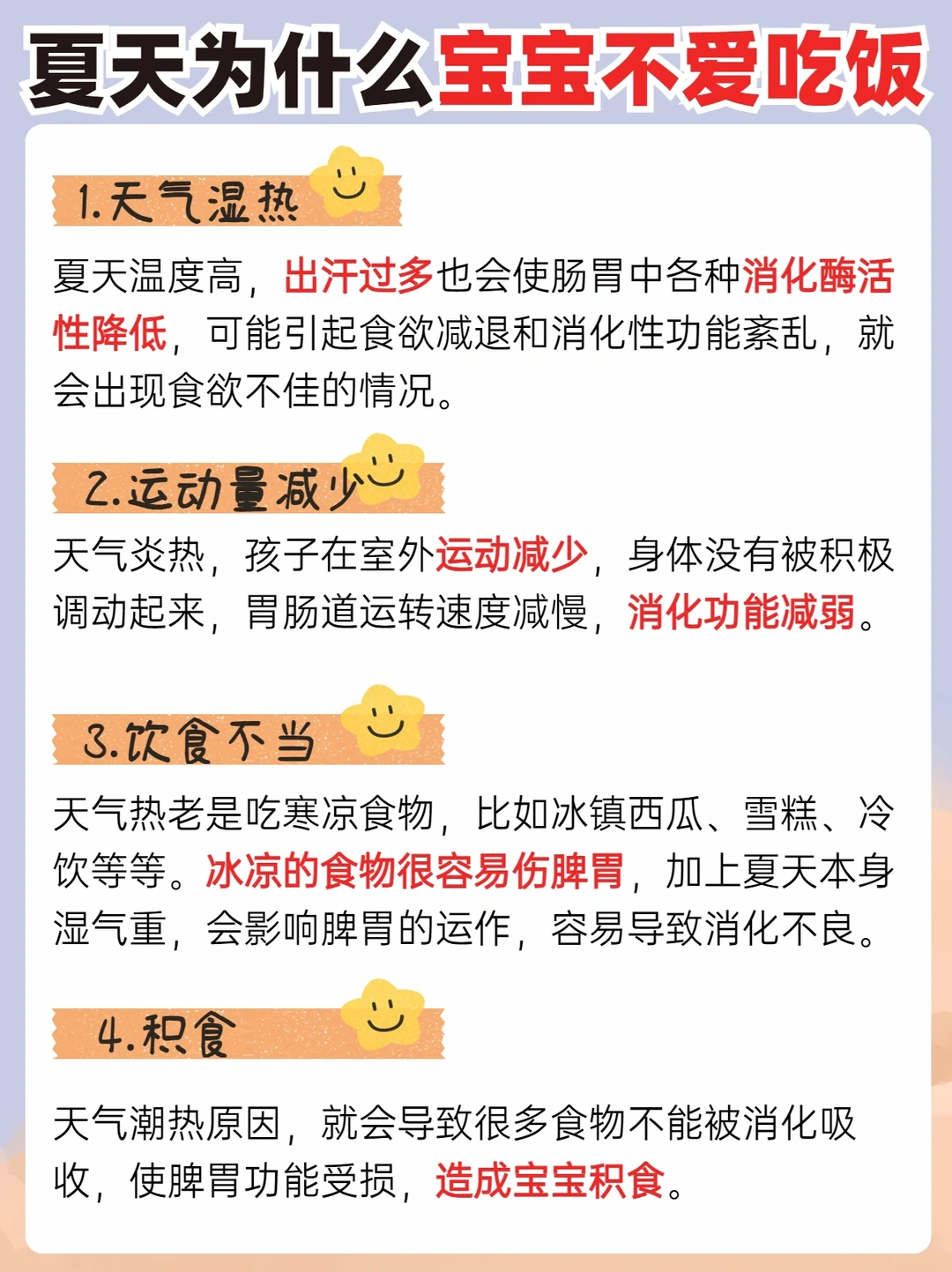 现在天气炎热,夏季孩子也没什么胃口,我整理了一些调节宝宝食欲的方法和健脾养胃的营养汤,🉑️增加食欲,调理脾胃,吃饭香香体身体更棒! 1.四星汤:消积祛湿 2.独脚金猪横俐汤:消食导滞 3.马蹄玉米胡萝卜汤:清热解暑,健脾开胃 4.秋柠饮:理气润燥、消食 宝宝消化不太好,容易积食腹胀、食欲不振的,可以试试这些消积解暑汤,促进消化,甜甜的宝宝都挺喜欢的~