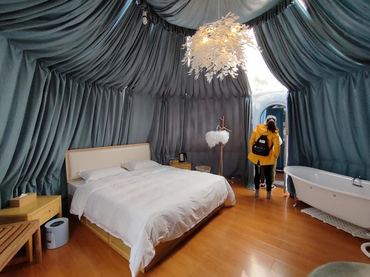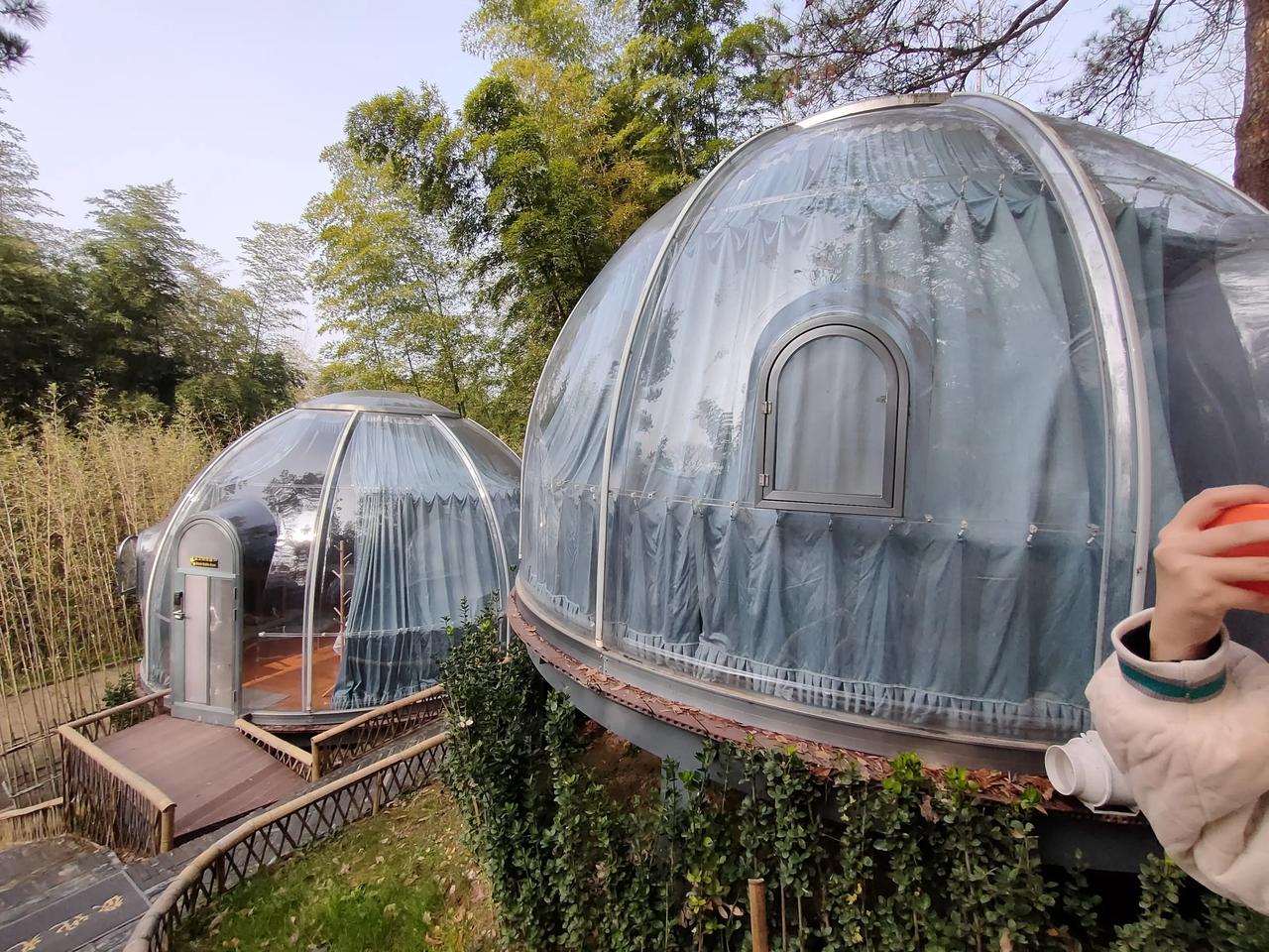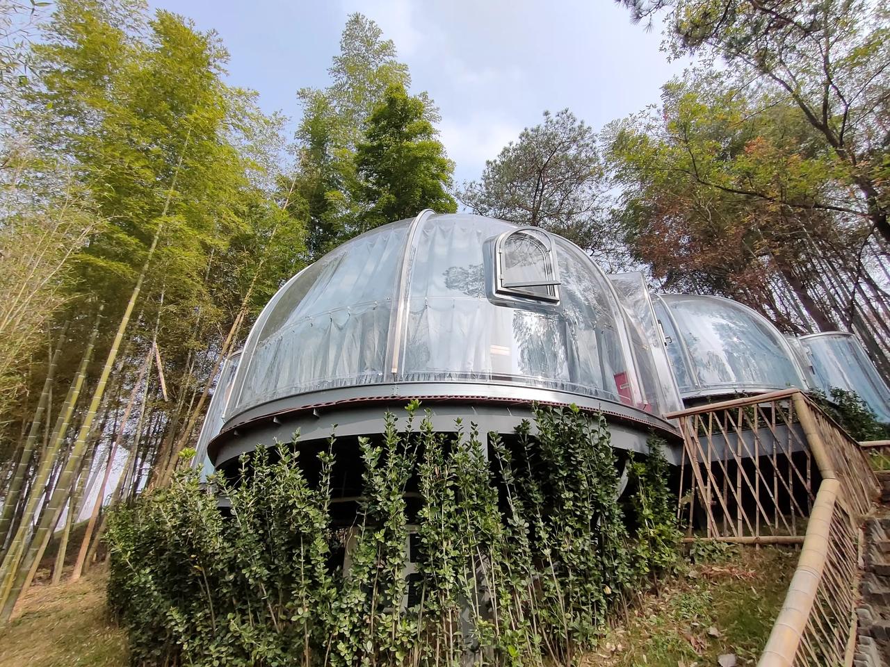 今天来河南信阳,固始县的西九华景区,晚上住这个网红泡泡屋,这风格太科幻了,晚上还可以一边泡澡一边看星星,简直yyds
