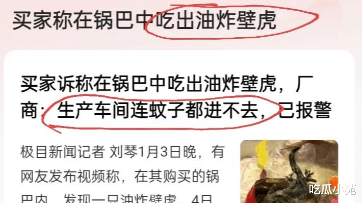 该视频的配文:“1月2日下午给我女儿开了一袋锅巴,因为怕她撒掉,我只开了一个小口,我女儿吃了两片后从里面拿出来了一只油炸过的大壁虎……”。