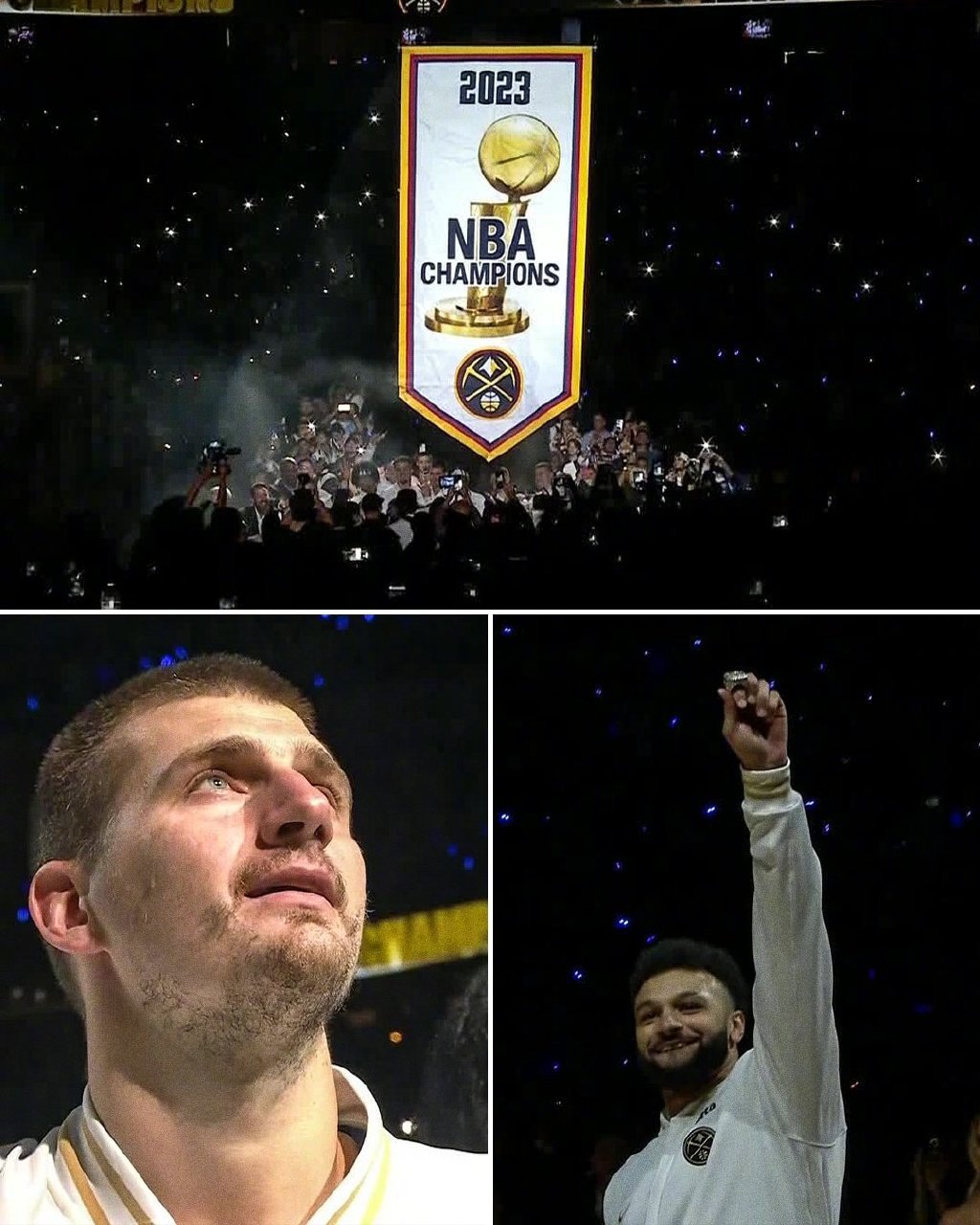 2023到2024赛季NBA常规赛正式开打!揭幕战前,掘金全队在主场球迷的欢呼下,依次登场领取属于自己的总冠军戒指 !