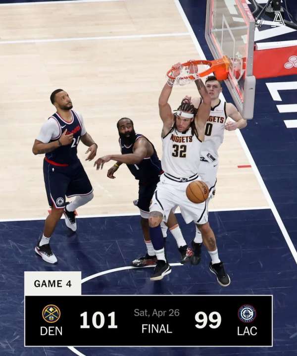 首轮对阵快船,七场大战,戈登场均可以交出18.9分5.7篮板2.1助攻,投篮命中率51.6%,并且在G4送上载入史册的空接压哨绝杀,从后来看,没有这一球,掘金连首轮都过不去。