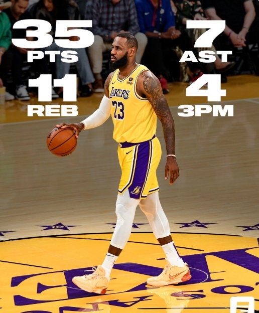 湖人方面,詹姆斯35分11篮板7助攻,拉塞尔27分6助攻,戴维斯27分10篮板,里夫斯15分9篮板7助攻;