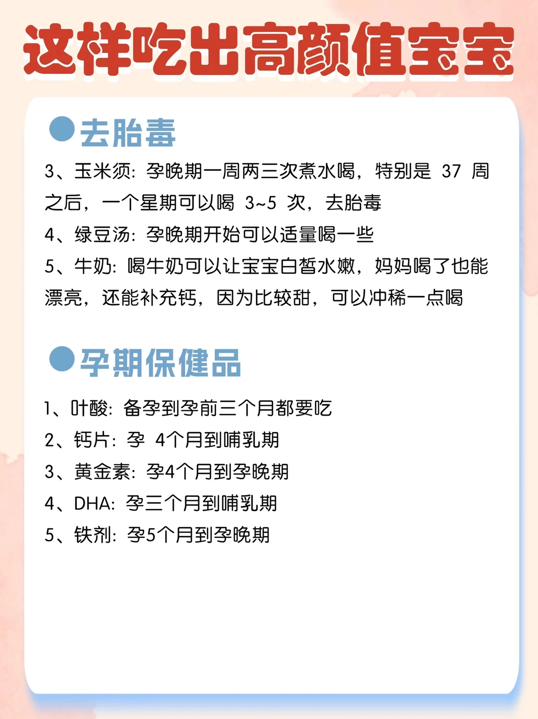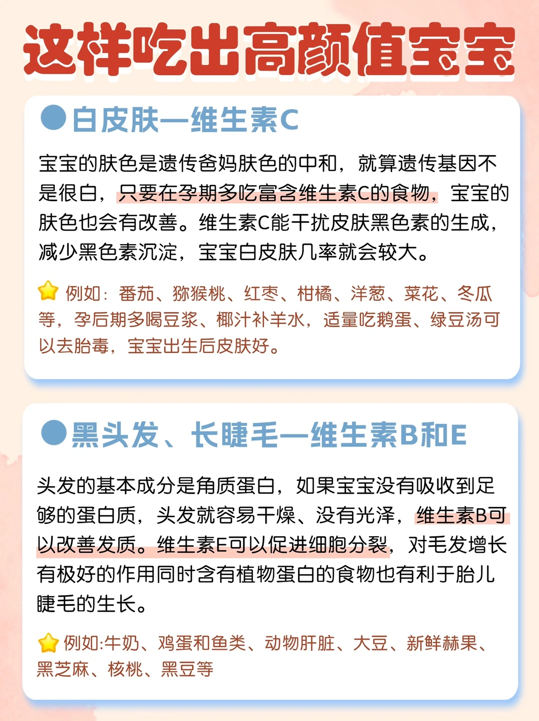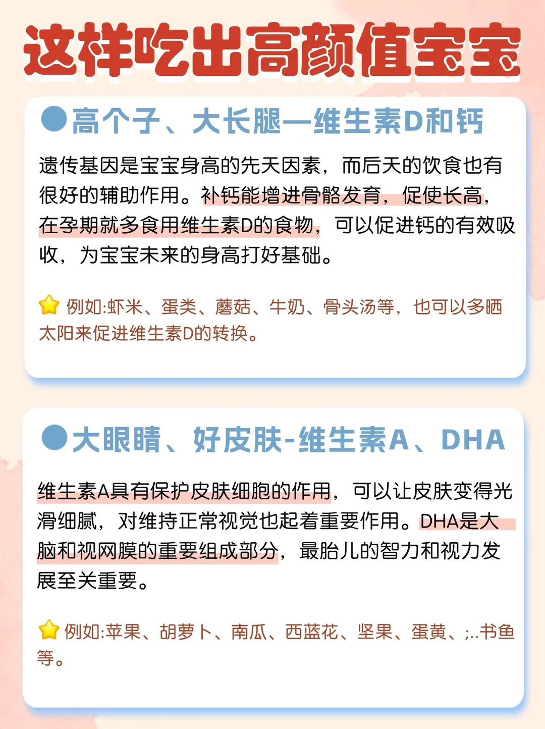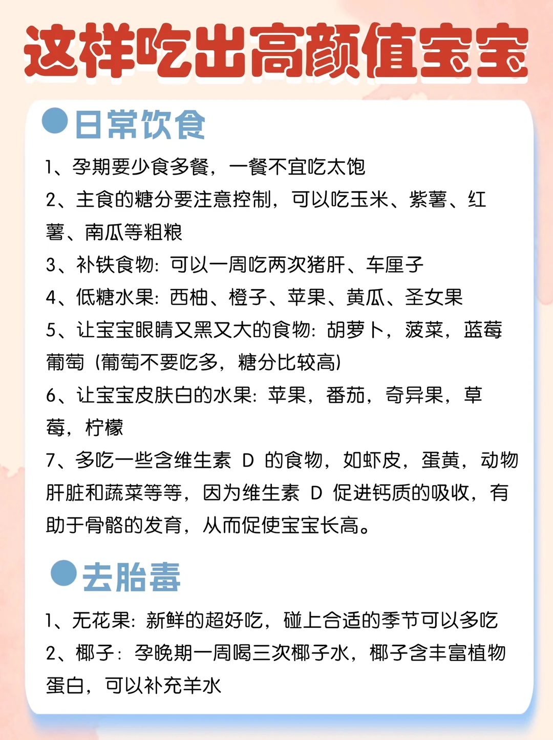 1、孕期要少食多餐,一餐不宜吃太饱 2、主食的糖分要注意控制,可以吃玉米、紫薯、红薯、南瓜等粗粮 3、补铁食物: 可以一周吃两次猪肝、车厘子 4、低糖水果: 西柚、橙子、苹果、黄瓜、圣女果 5、让宝宝眼睛又黑又大的食物: 胡萝卜,菠菜,蓝莓葡萄 (葡萄不要吃多,糖分比较高) 6、让宝宝皮肤白的水果: 苹果,番茄,奇异果,草莓,柠檬 7、多吃一些含维生素 D 的食物,如虾皮,蛋黄,动物肝脏和蔬菜等等,因为维生素 D 促进钙质的吸收,有助于骨骼的发育,从而促使宝宝长高。