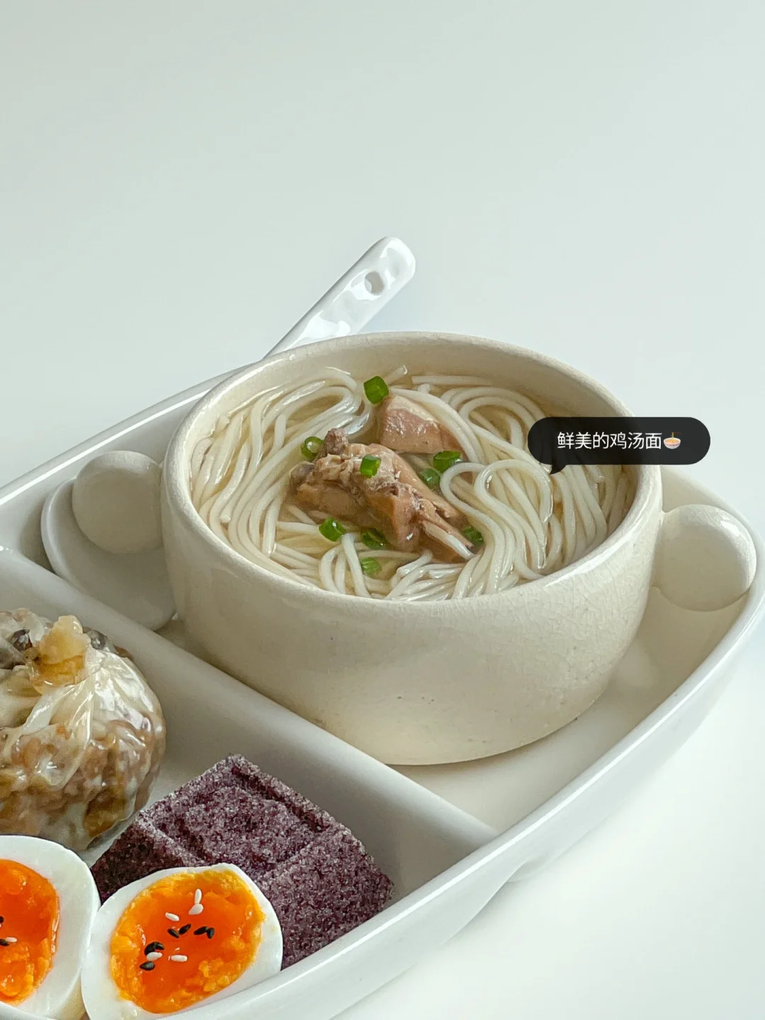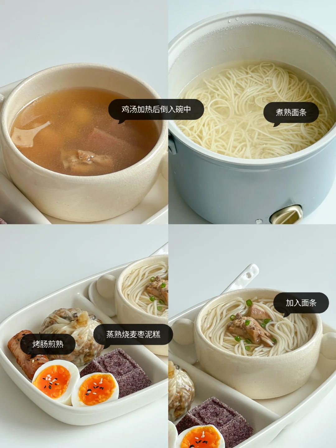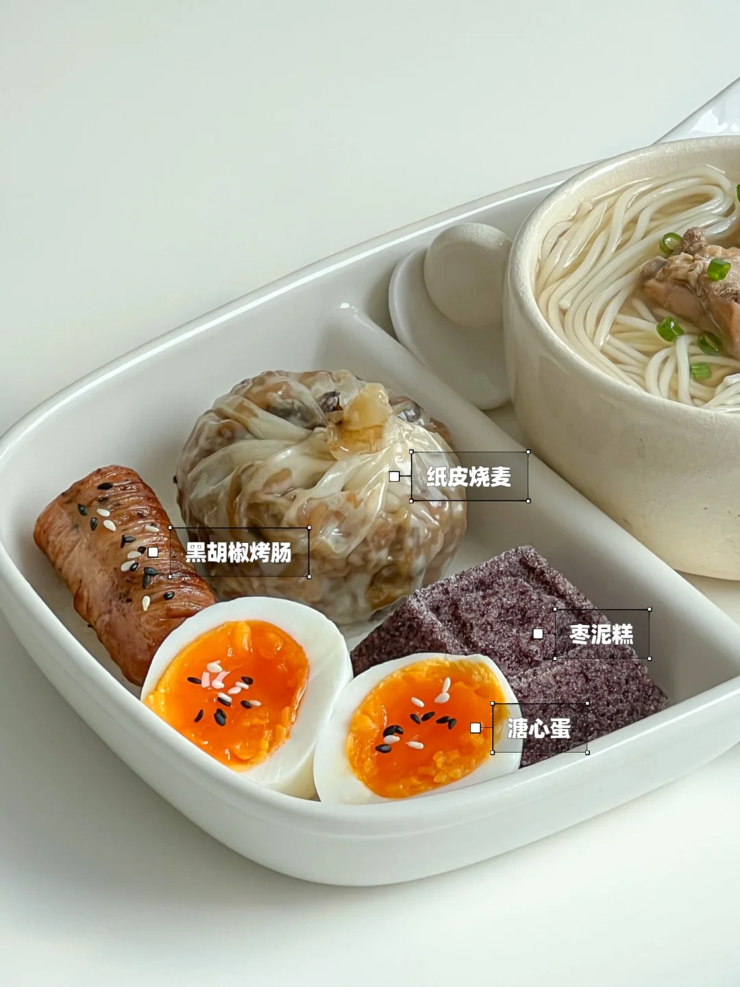 每天早起就是为了这一口🤤 中国胃表示太爱中式早餐啦~ · 🧾食材: 鸡汤、面条、鸡蛋🥚、纸皮烧麦、枣泥糕、黑胡椒烤肠 👩🏻🍳做法: ❶鸡汤加热,面条煮熟放入鸡汤中 ❷纸皮烧麦、枣泥糕上锅蒸熟 ❸水开下可生食鸡蛋,煮6分钟捞出过冷水 ❹烤肠煎熟 · 鸡汤面我用的是自热的陈皮雪梨百合土鸡汤,只需要旋转一下,8分钟就可以喝到一碗热腾腾的广式土鸡汤啦,鸡肉软嫩,汤汁鲜美,和家中小火慢炖好几个小时鸡汤的味道一样,然后再煮点面条放进去,10分钟get鲜美的鸡汤面,今天的快乐是豹大厨给的~🤭