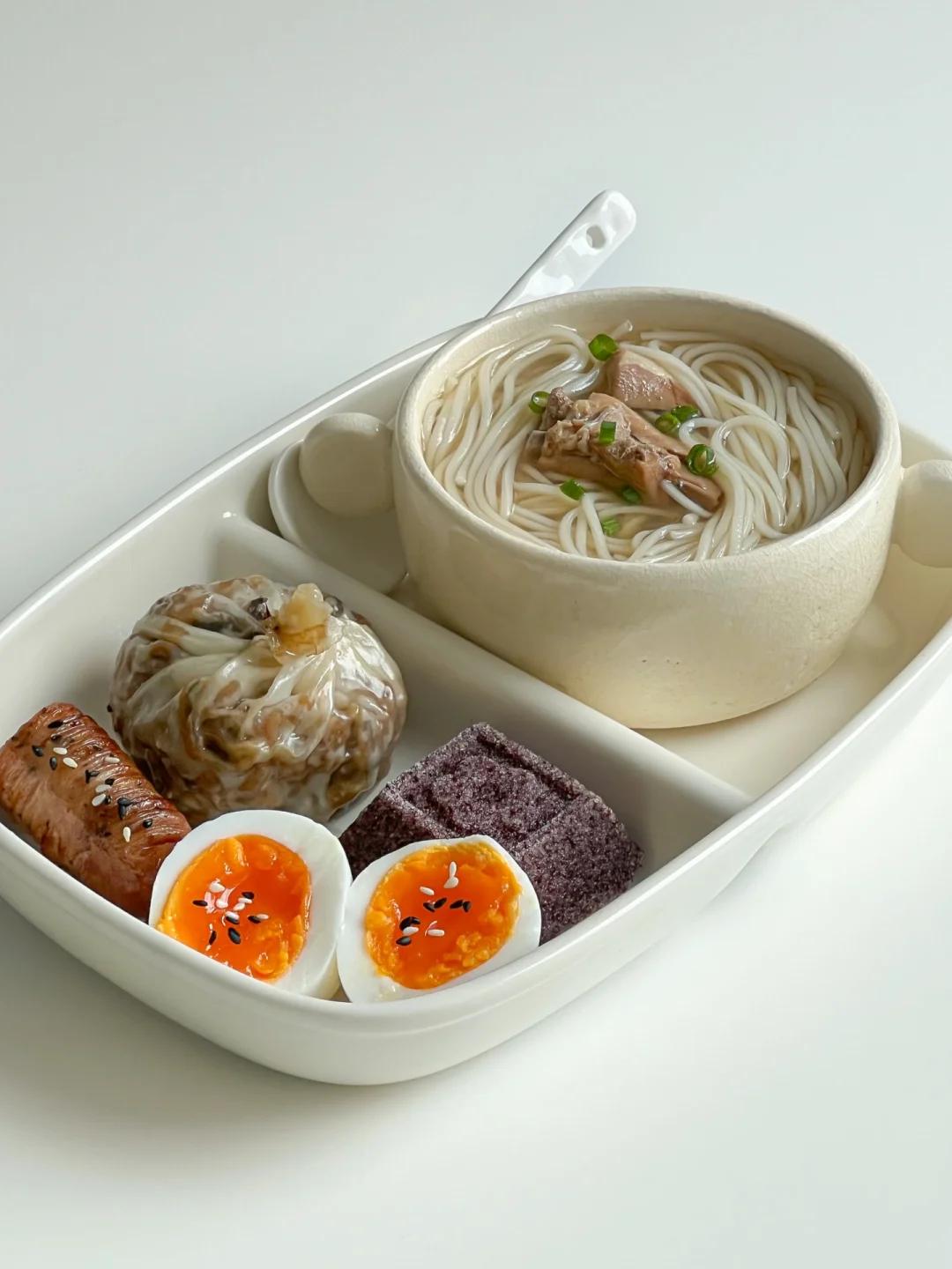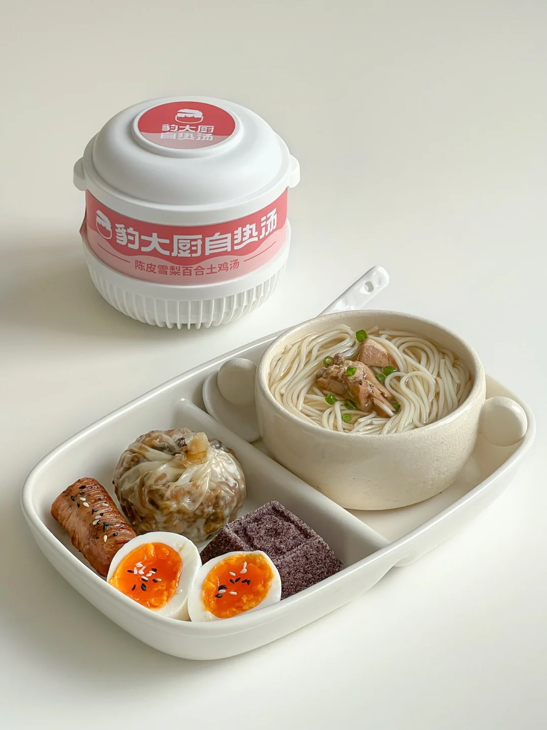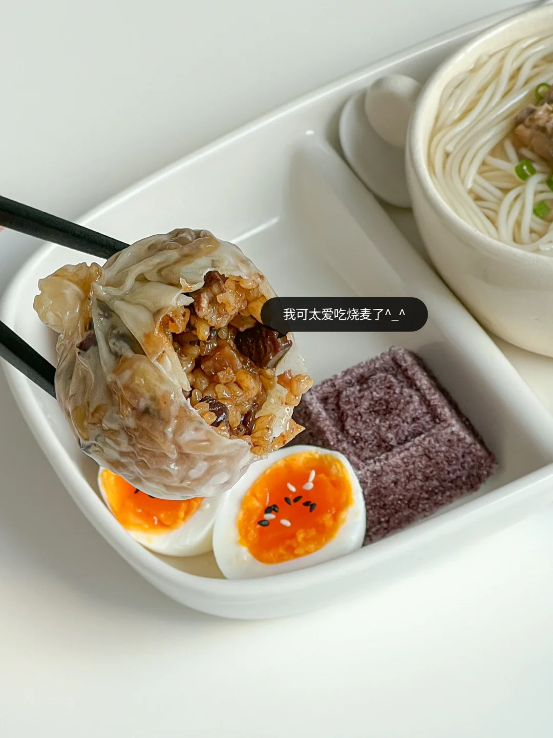 每天早起就是为了这一口🤤 中国胃表示太爱中式早餐啦~ · 🧾食材: 鸡汤、面条、鸡蛋🥚、纸皮烧麦、枣泥糕、黑胡椒烤肠 👩🏻🍳做法: ❶鸡汤加热,面条煮熟放入鸡汤中 ❷纸皮烧麦、枣泥糕上锅蒸熟 ❸水开下可生食鸡蛋,煮6分钟捞出过冷水 ❹烤肠煎熟 · 鸡汤面我用的是自热的陈皮雪梨百合土鸡汤,只需要旋转一下,8分钟就可以喝到一碗热腾腾的广式土鸡汤啦,鸡肉软嫩,汤汁鲜美,和家中小火慢炖好几个小时鸡汤的味道一样,然后再煮点面条放进去,10分钟get鲜美的鸡汤面,今天的快乐是豹大厨给的~🤭