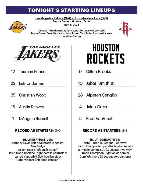 #湖人vs火箭##NBA你我皆主角# 双方首发如下:湖人首发:拉塞尔、里夫斯、普