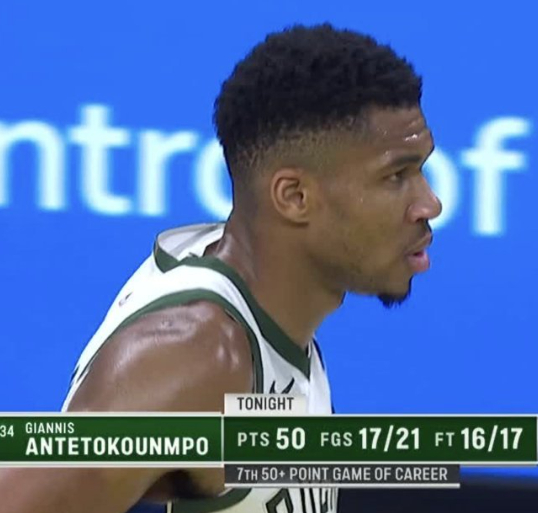 The Athletic晒出字母哥的赛场照并配文:50分了,而比赛仍然还剩10分钟。