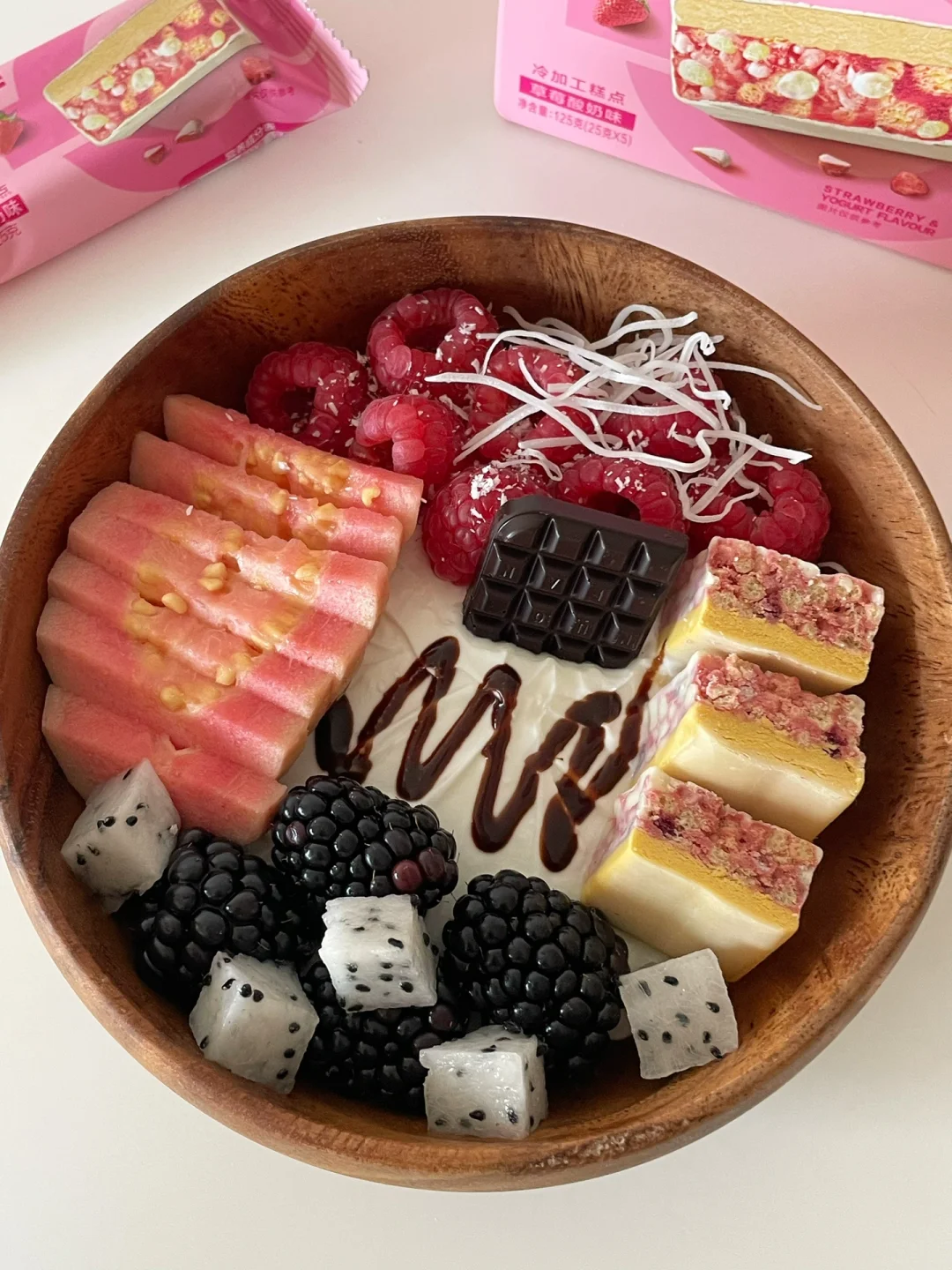 2⃣️加入草莓酸奶味蛋白棒,切块装饰。