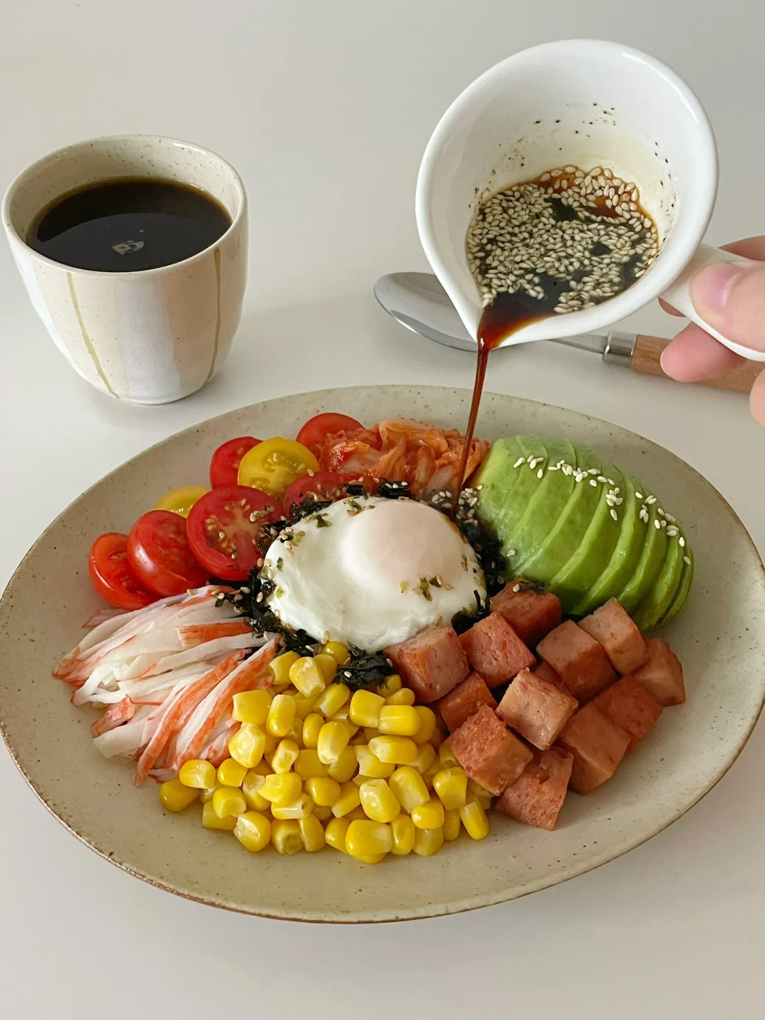 4⃣️制作油醋汁:两勺生抽、一勺陈醋、一勺蜂蜜、一勺橄榄油搅匀,加黑胡椒碎和白芝麻。
