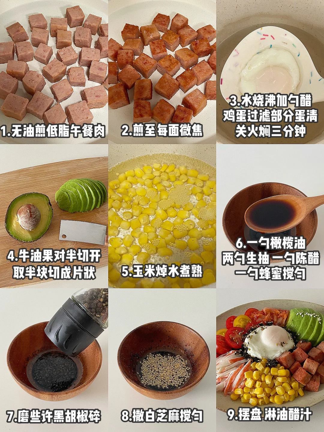 1⃣️糙米饭提前蒸熟备用。午餐肉煎熟,玉米焯水,牛油果切片。