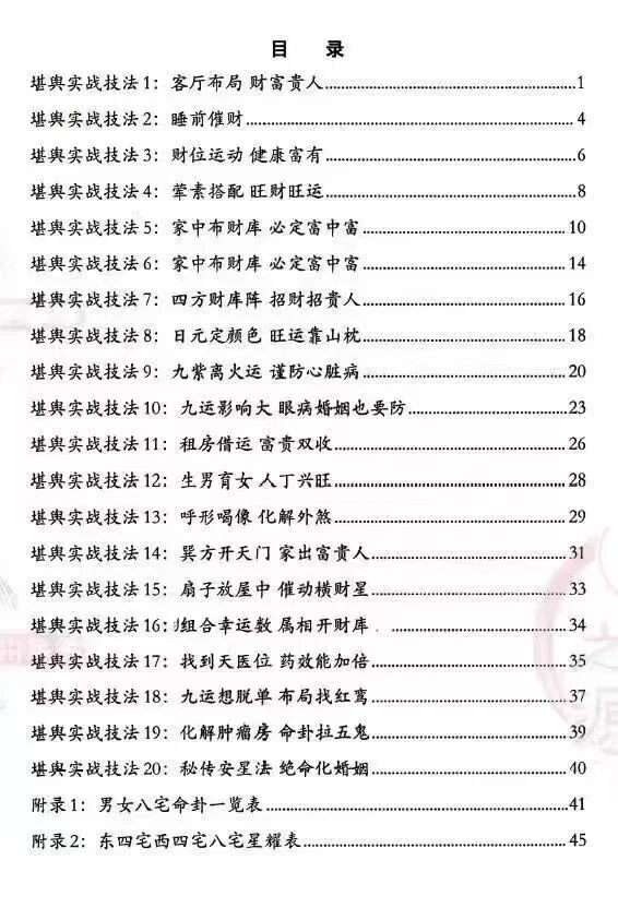 典籍最核心的价值,在于技法实操性与场景适配性。书中讲解摒弃抽象理论,以 “步骤化、案例化” 呈现:龙脉辨识章节拆解 “望势、察形、辨气” 三步法,附山地、平原、水乡等地形的辨别差异;阳宅布局部分针对门窗朝向、功能区划分问题,给出 “测量→判吉凶→调方案” 完整流程,还包含罗盘校准、尺寸适配等工具使用指南,确保读者能按图索骥转化为实操能力。