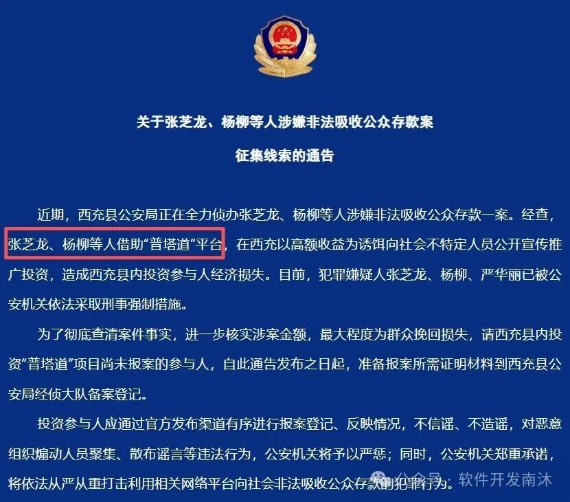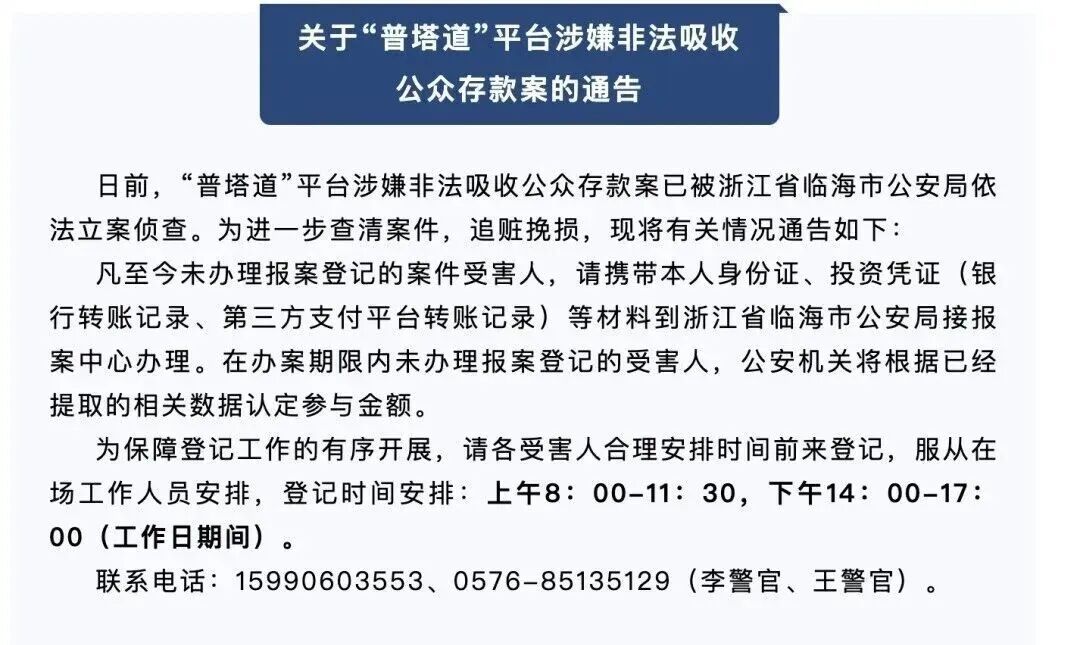 近日,浙江省临海市公安局正式对“普塔道”平台涉嫌非法吸收公众存款案立案侦查,并发布通告。