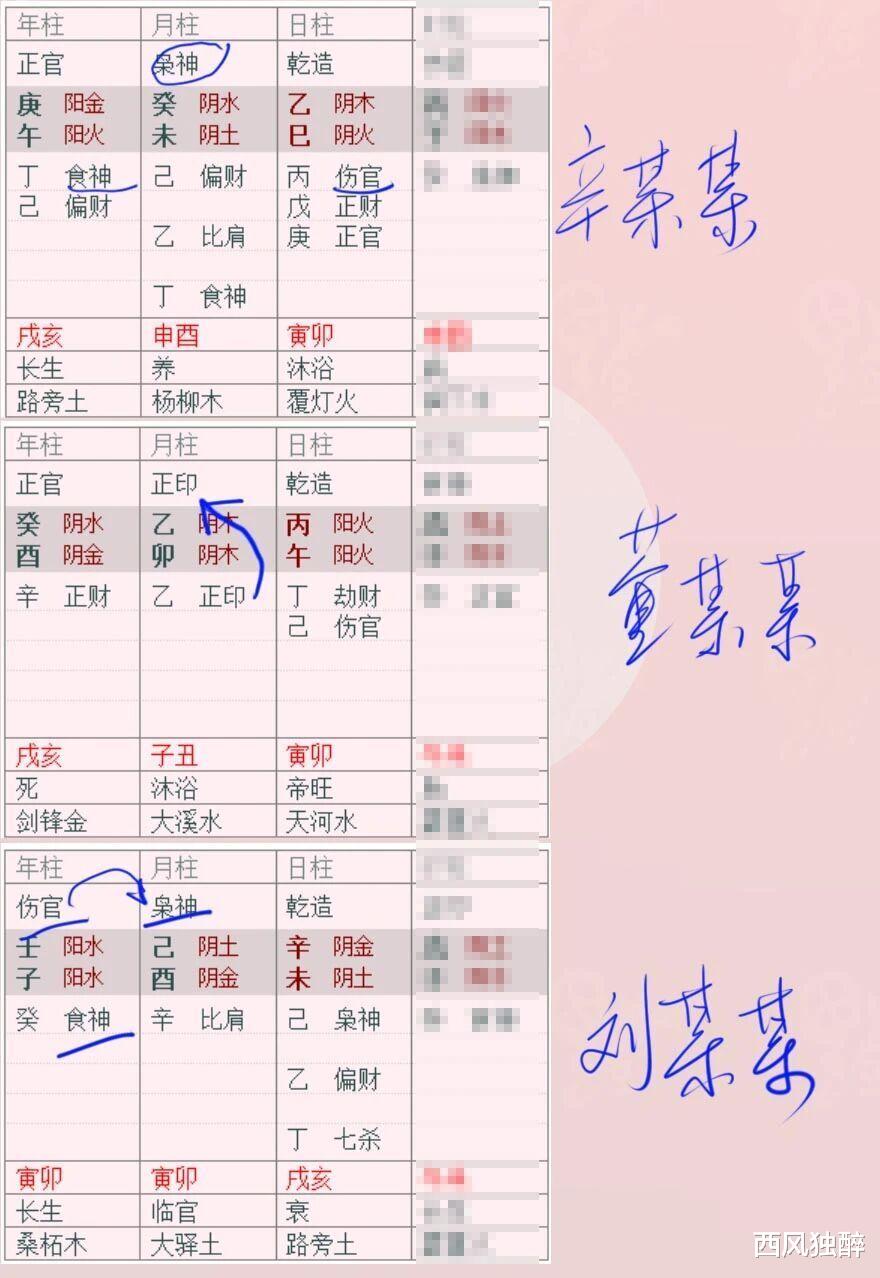 2. 除了某哥、祝某某七杀透干,某某酱正官透干(月令正印),郑某某食伤透干(月令偏印)外,其他均为印星透干。其中,董某某为正印通根透干,其他为偏印透干。