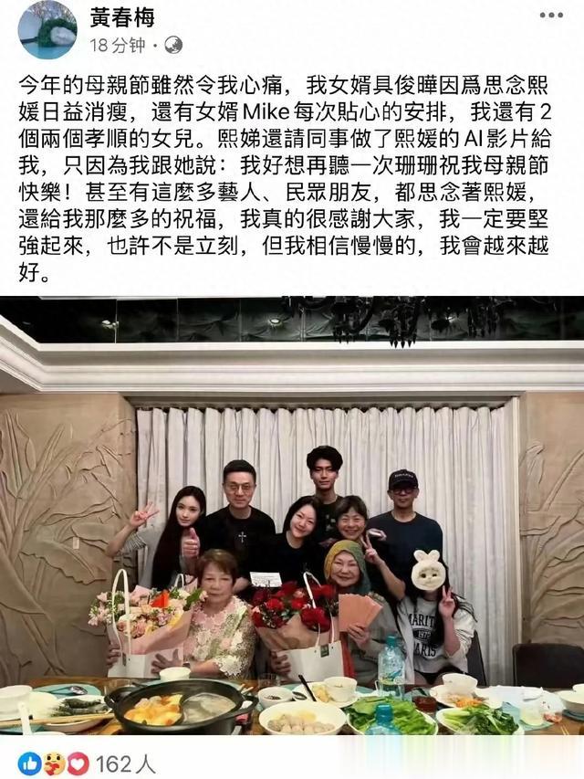12日s妈发文称这个母亲节虽然仍然沉浸在痛苦中无法自拔,但有小女儿贴心制作的熙媛的Ai影片,有女婿许雅筠的贴心组织的家庭聚会,心里也宽慰了不少!