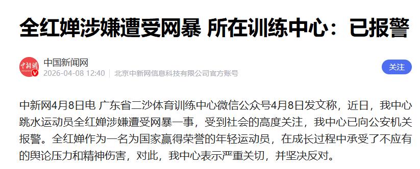 “全红婵作为一名为国家赢得荣誉的年轻动员,在成长过程中承受了不应有的舆论压力和精神伤害,对此,我中心表示严重关切,坚决反对。目前已向公安机关报警。”