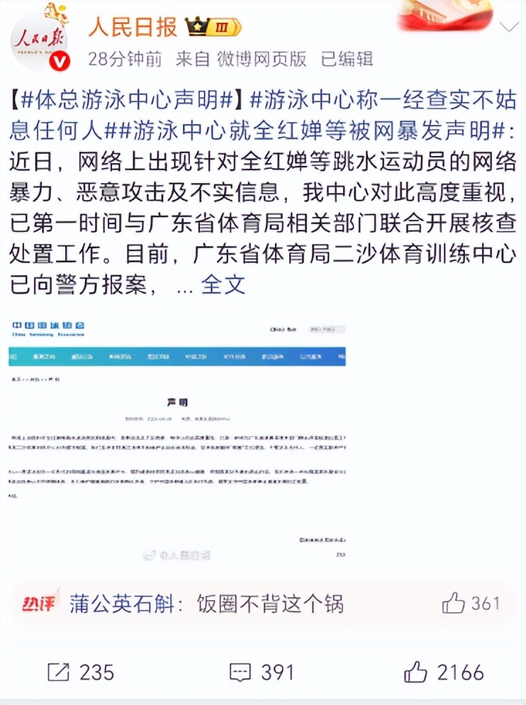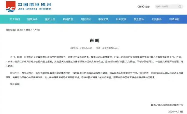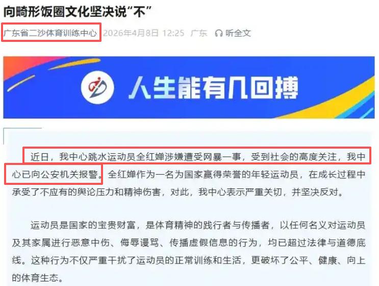 正式发布声明:已就全红婵遭遇网络暴力一事,向公安机关报警。