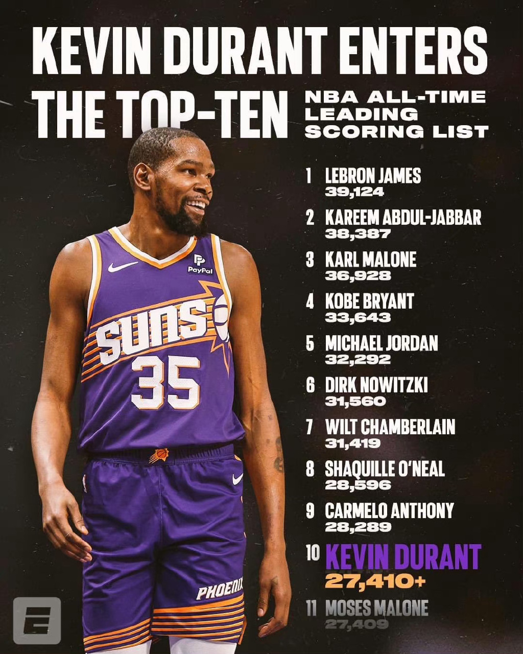 詹姆斯发推恭喜杜兰特历史得分榜第十!