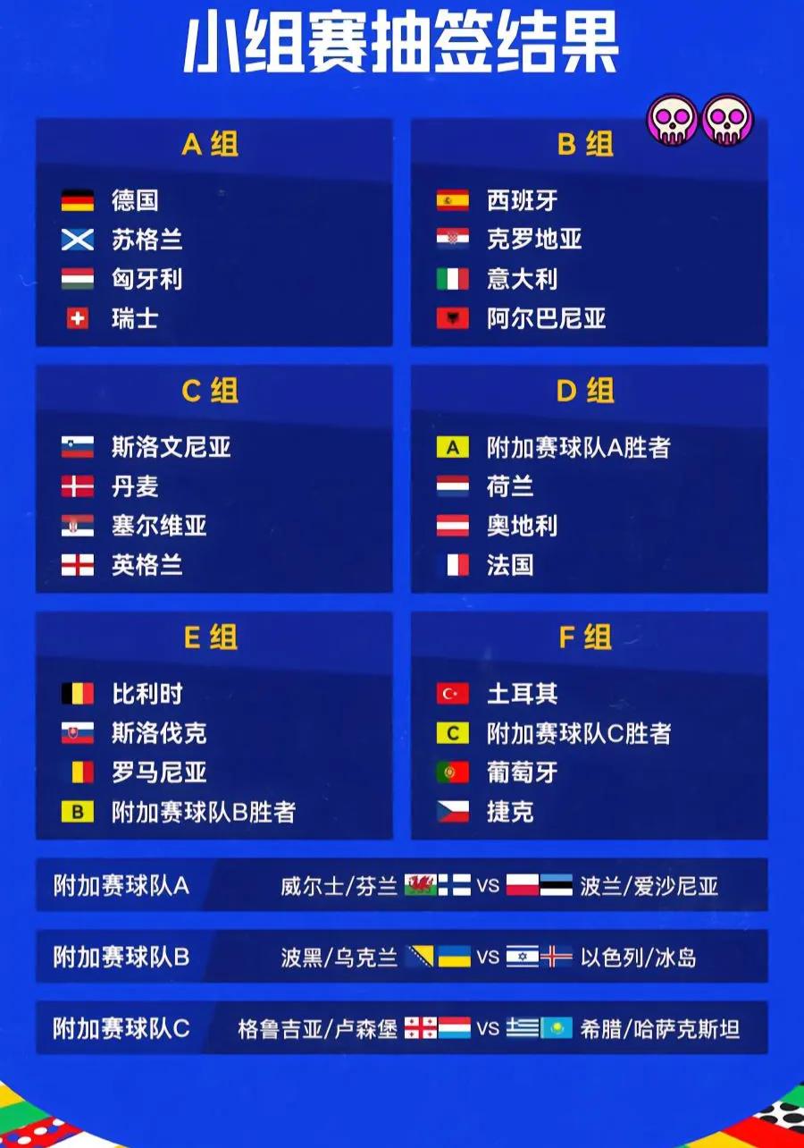 2024欧洲杯分组,鱼腩德国队造死亡之组?C罗做梦都要笑醒![捂脸]造记录的绝佳机会来了,但是B组才会是球迷更关注的对决,也是“死亡组”的有力冲击者。 A组:德国(东道主)、匈牙利、苏格兰、瑞士 B组:西班牙、阿尔巴尼亚、克罗地亚、意大利 C组:英格兰、丹麦、斯洛文尼亚、塞尔维亚 D组:法国、奥地利、荷兰、附加赛球队A(威尔士/芬兰vs波兰/爱沙尼亚) E组:比利时、罗马尼亚、斯洛伐克、附加赛球队B(波黑/乌克兰vs以色列/冰岛) F组:葡萄牙、土耳其、捷克、附加赛球队C(格鲁吉亚/卢森堡vs希腊/哈萨克斯坦)