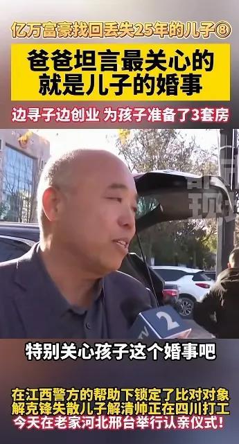 泪奔!亿万富豪终于找回丢失25年儿子!1996年,解克锋开始创业,在外承包建筑工程项目。25年前,1998年的时候,解克锋带着妻儿在河北邢台承包项目,同年农历8月24日,解克锋的二儿子解清帅出生了,夫妻当时很是高兴。