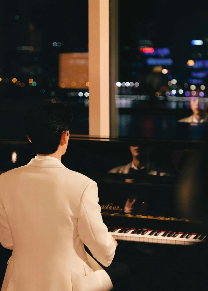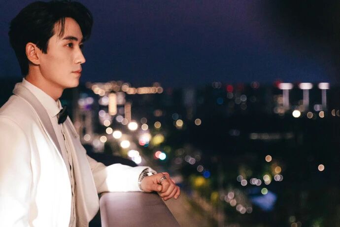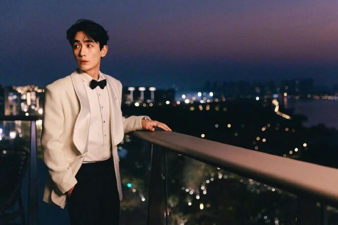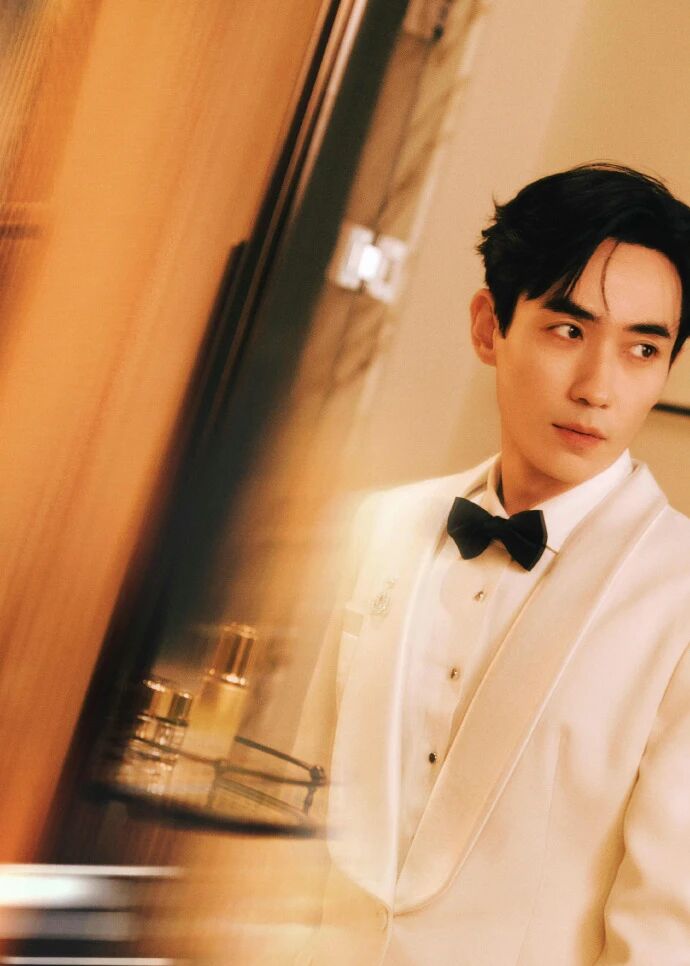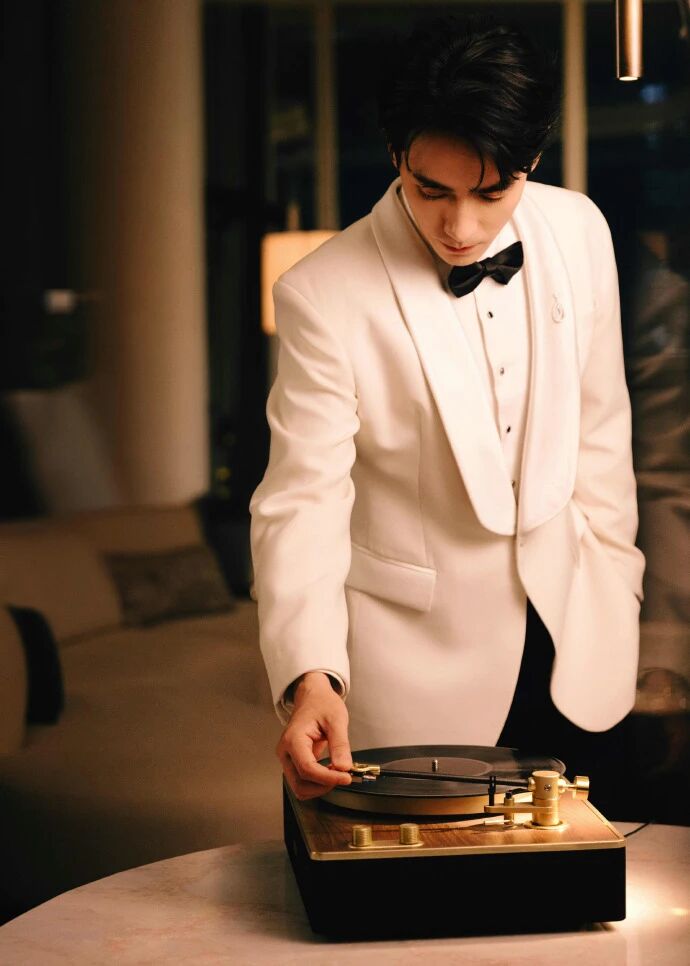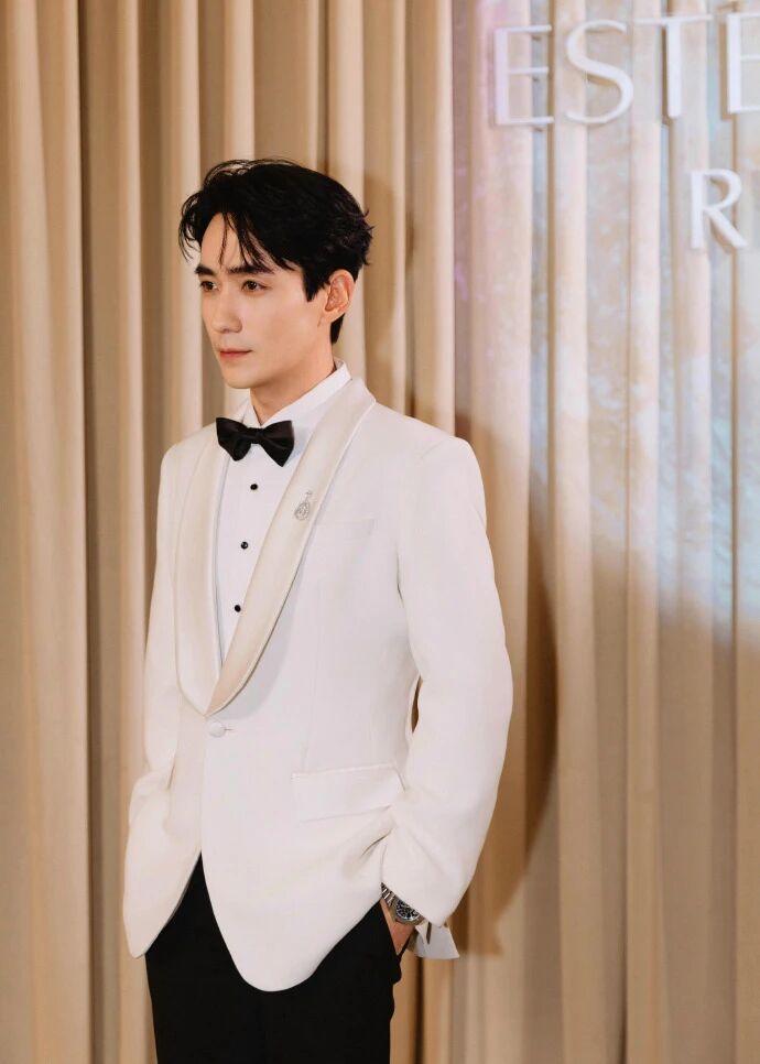 :白西装的肩线是 “挺而不僵”—— 刚好卡在肩峰的柔弧外沿,没硬成 “刻板的绅士壳”;驳领的宽细衬着颈骨的润,把 “经典西装的正” 焊在了 “骨的雅” 里,像 “为他的温润骨量身裁的绅装”。