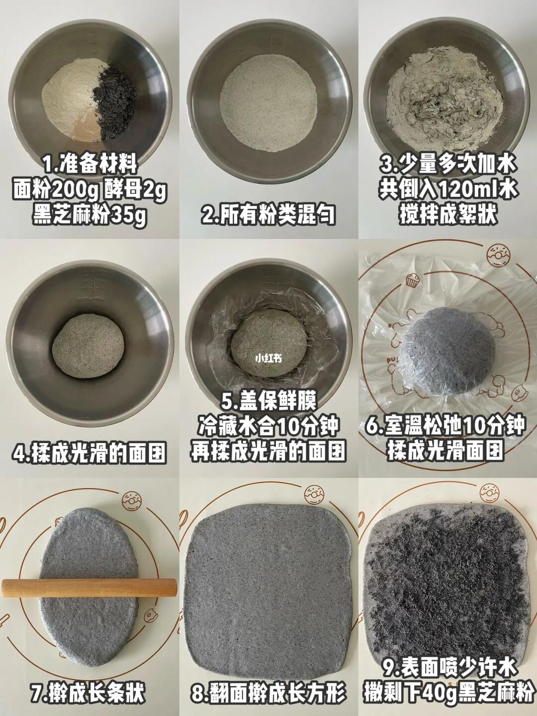 1️⃣面粉200g、酵母2g、自制黑芝麻粉35g搅拌均匀,少量多次加水搅拌成絮状再揉成光滑面团。