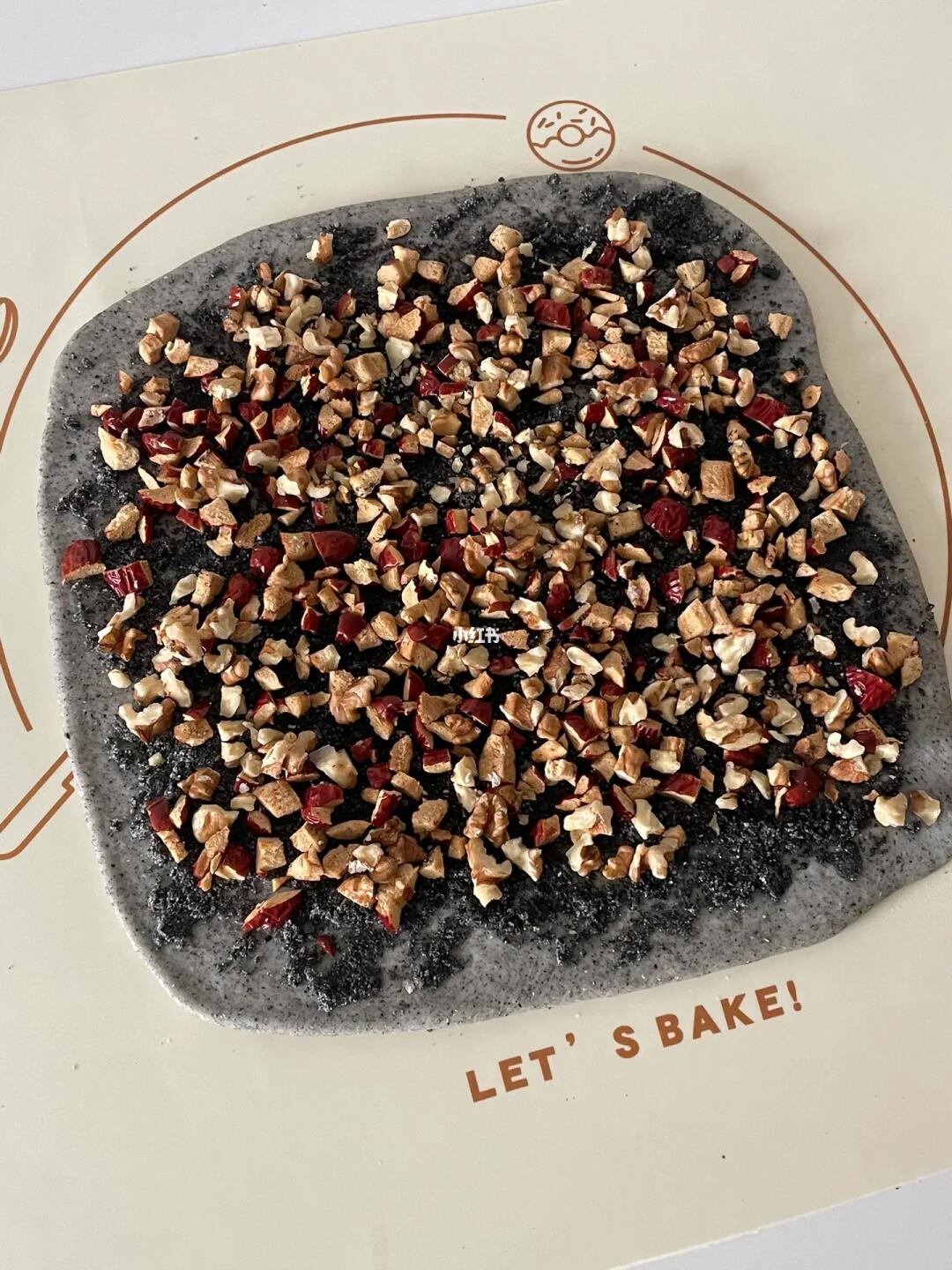 4️⃣擀面杖擀成长条后翻面,再擀成长方形,表面喷水,抹上剩下的40g黑芝麻粉,再加入红枣碎和核桃碎,轻轻按压后收拢捏紧。