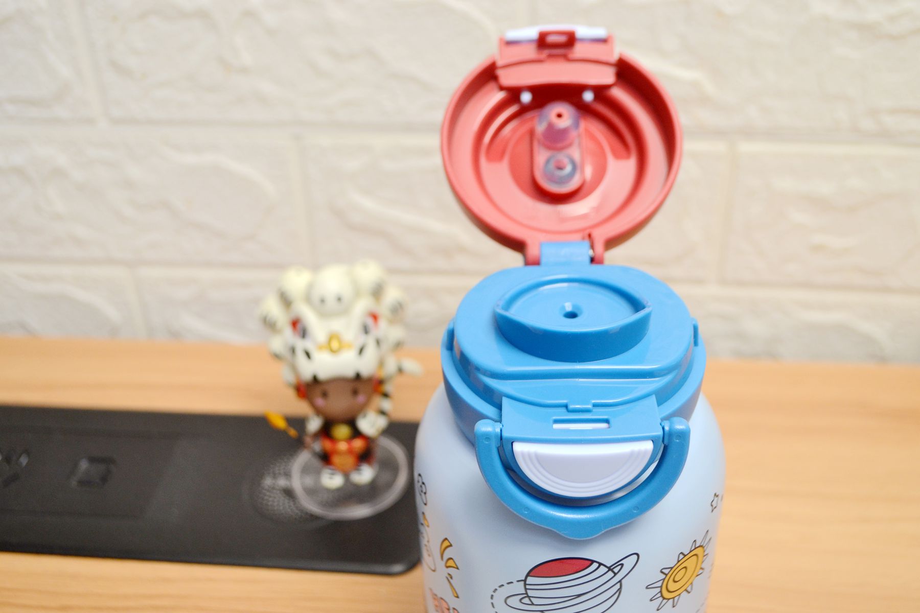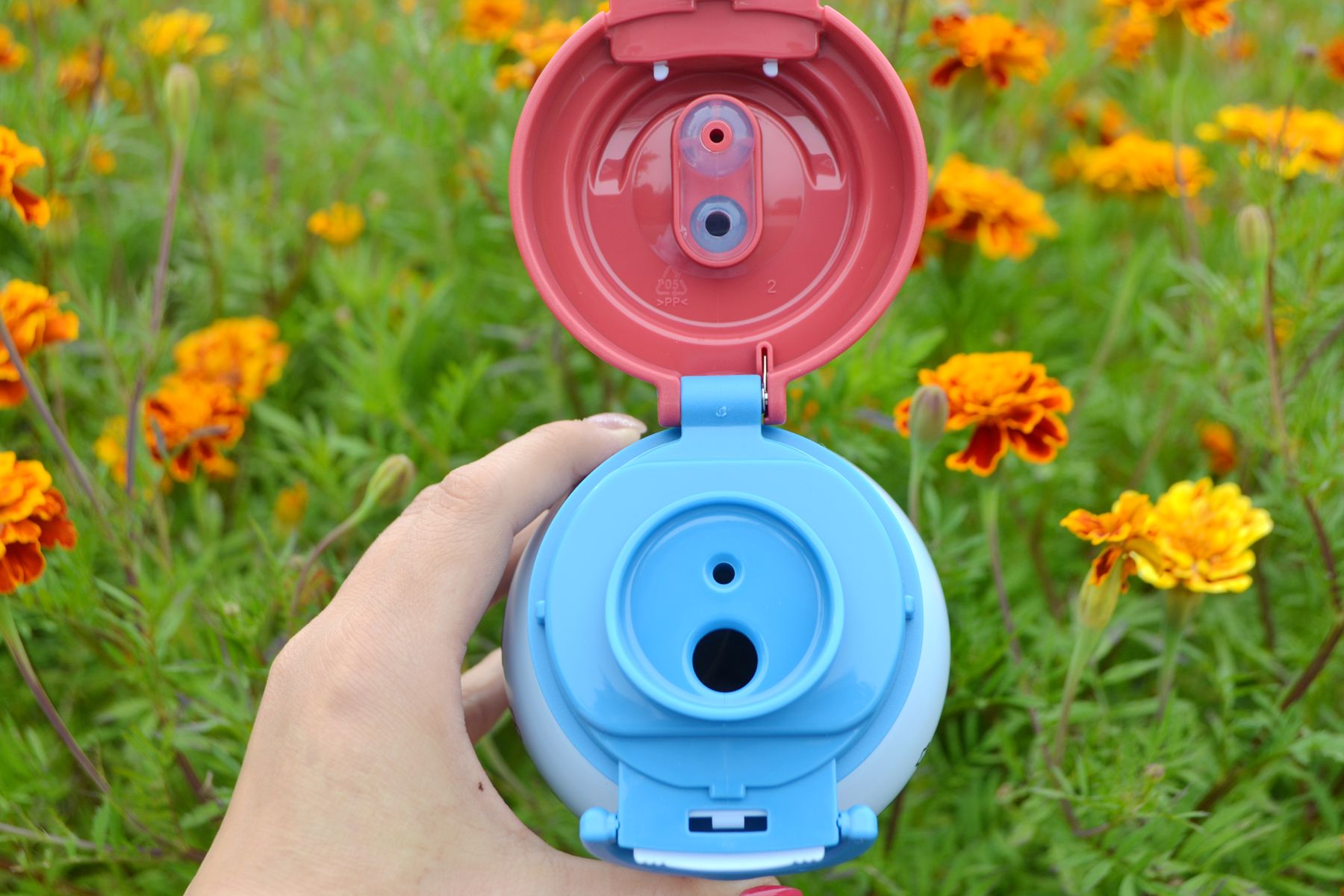 这款保温杯最具特色的就是双饮设计,完美适配了不同场景下的饮用习惯。直饮口采用弹跳盖设计,按下按钮即可弹出,出水口大小适中,水流平缓,孩子仰头饮用时不易呛水;吸管口则隐藏在另一侧的旋转盖内,吸管质地柔软有弹性,咬吸力度适中,适合课间快速补水。 经过倒置摇晃测试,无论是直饮口还是吸管口都没有出现漏水情况,放入书包中也无需担心弄湿书本。