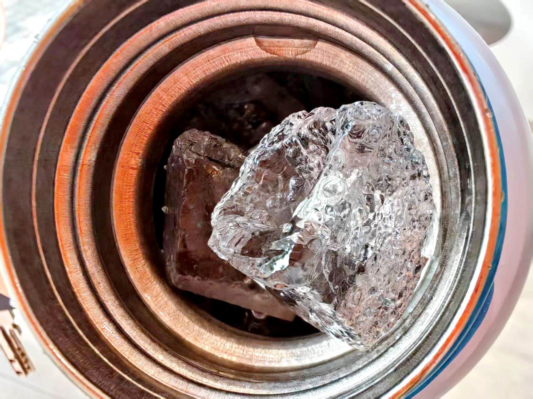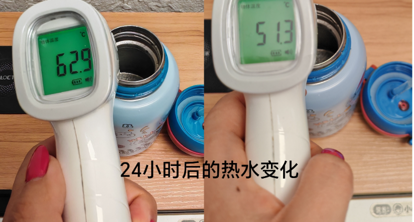 宫菱更是凭借其独特的加厚双层真空层设计,在保温测试中,我们向杯中注入 62.9℃的热水,拧紧杯盖后放置 24 小时,测得水温仍保持在 51℃左右;注入加冰水,24 小时后,冰块仍然能清晰可见,保冷效果都达到了宣传标准,完全能满足孩子在校期间随时喝到适宜温度饮品的需求。