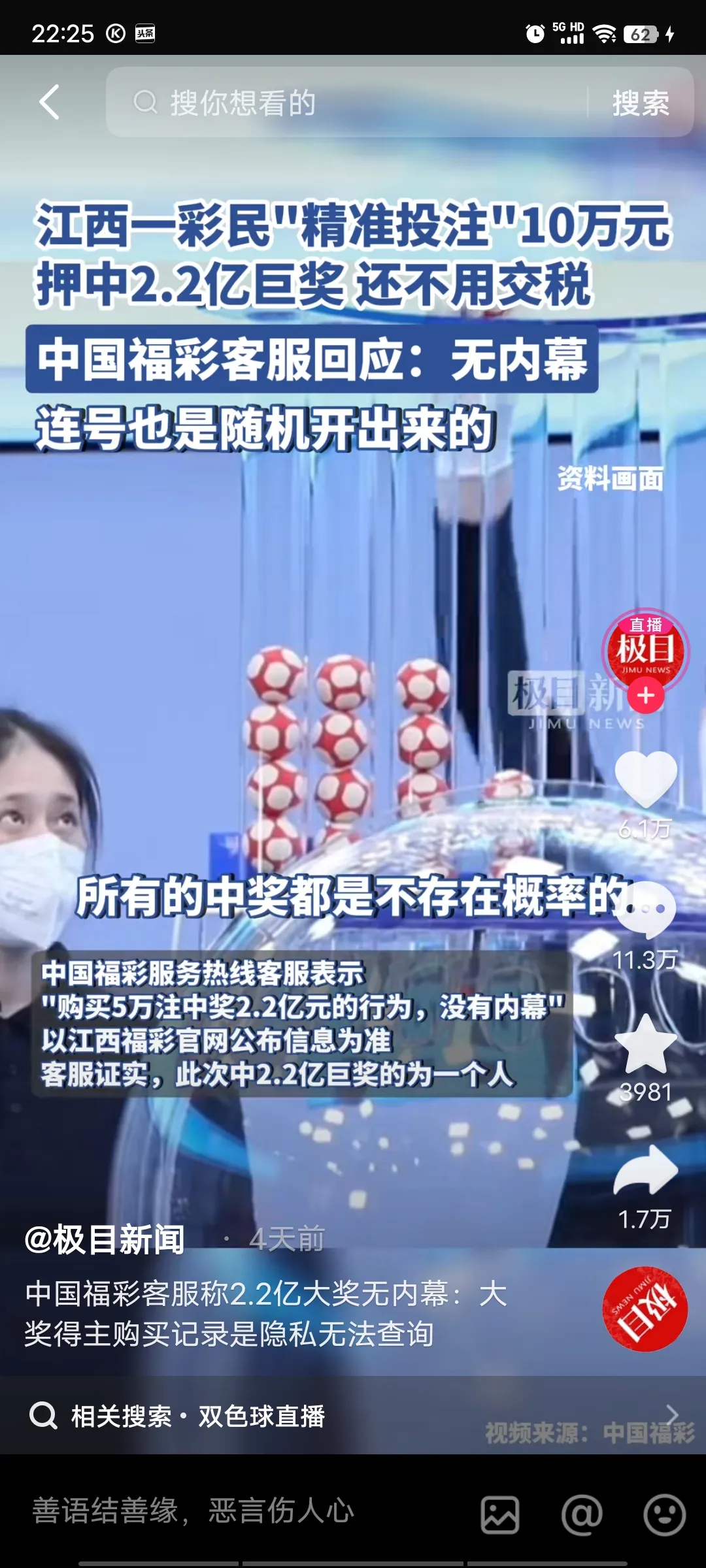但最近江西南昌2.2亿中奖这个事给我弄懵了,一个人,在两家彩站,花费10万元,50000倍单压一组号码,神奇的是竟然全中了,简直离了大谱了,简直让人无法相信。