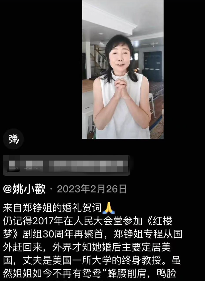 在去年,郑铮曾出镜为好友送上新婚祝福,当时好友透露,她丈夫是美国一所大学的终身教授,她婚后主要定居美国,已在美国生活了20多年。