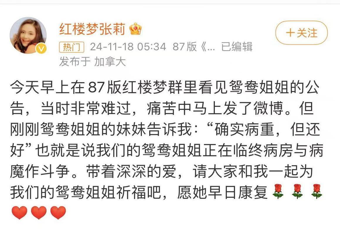 早在数日之前,87版《红楼梦》“薛宝钗”的扮演者张莉就曾悲痛发文,宣称“鸳鸯姐姐”已经辞别人世,不过随后她又删除贴文加以更正,声称“鸳鸯姐姐”目前还在临终病房,虽然病情危重,但当下情况还算稳定。可以确认的一点是,郑铮生前罹患癌症,即便一直积极接受治疗,但病情还是在逐步恶化中。