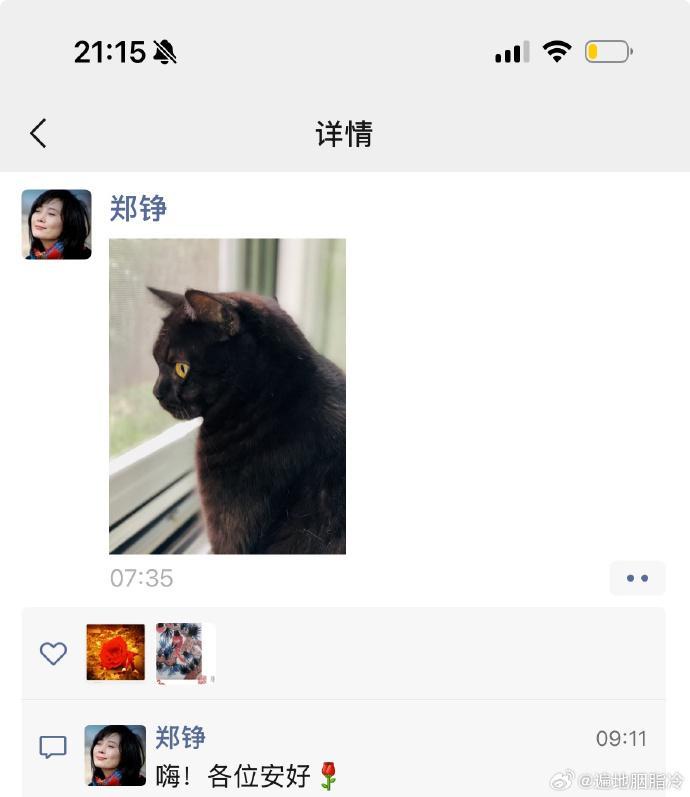 11月18日,在张莉误发郑铮去世的消息之后,郑铮本人还特意更新动态与大家报平安,配图是一只漂亮的黑猫认真凝视着窗外,似乎也折射出郑铮想要摆脱病床,恢复自由的心境。