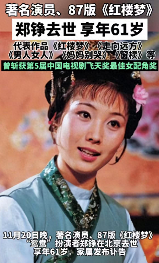 据悉,郑铮早年因为出演87版《红楼梦》的“金鸳鸯”一角而名声大噪,此后的郑铮开始活跃在荧幕之上,1985年,凭借作品《走向远方》,郑铮将当年的飞天奖最佳女配奖杯揽入怀中,此后的她陆续出演作品《白色山岗》《巴山杜鹃红》,大多都是农村题材的正剧。