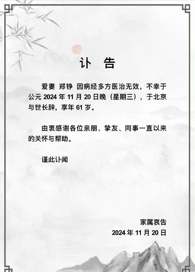 日前丈夫已经对外发布讣告,透露妻子是因为患病于11月20日在北京去世,期间也接受了多方救治,可惜依旧是无力回天。