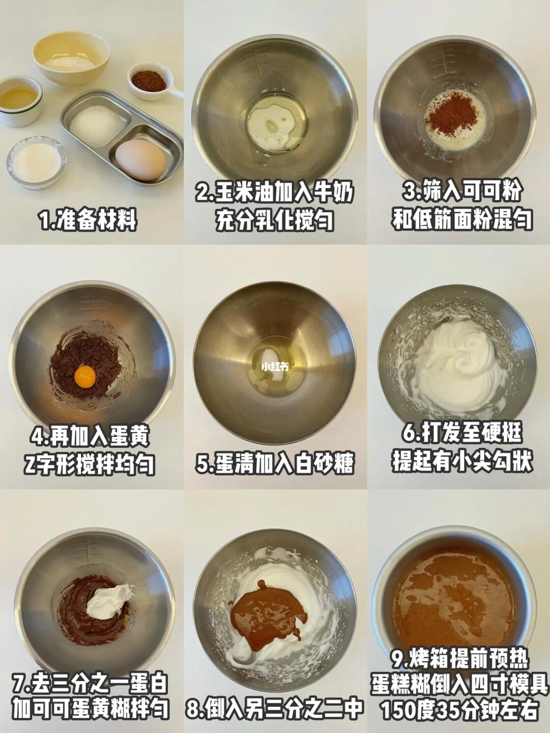 1️⃣玉米油和牛奶混合乳化均匀,再筛入低筋面粉和可可粉,z字形搅拌均匀。