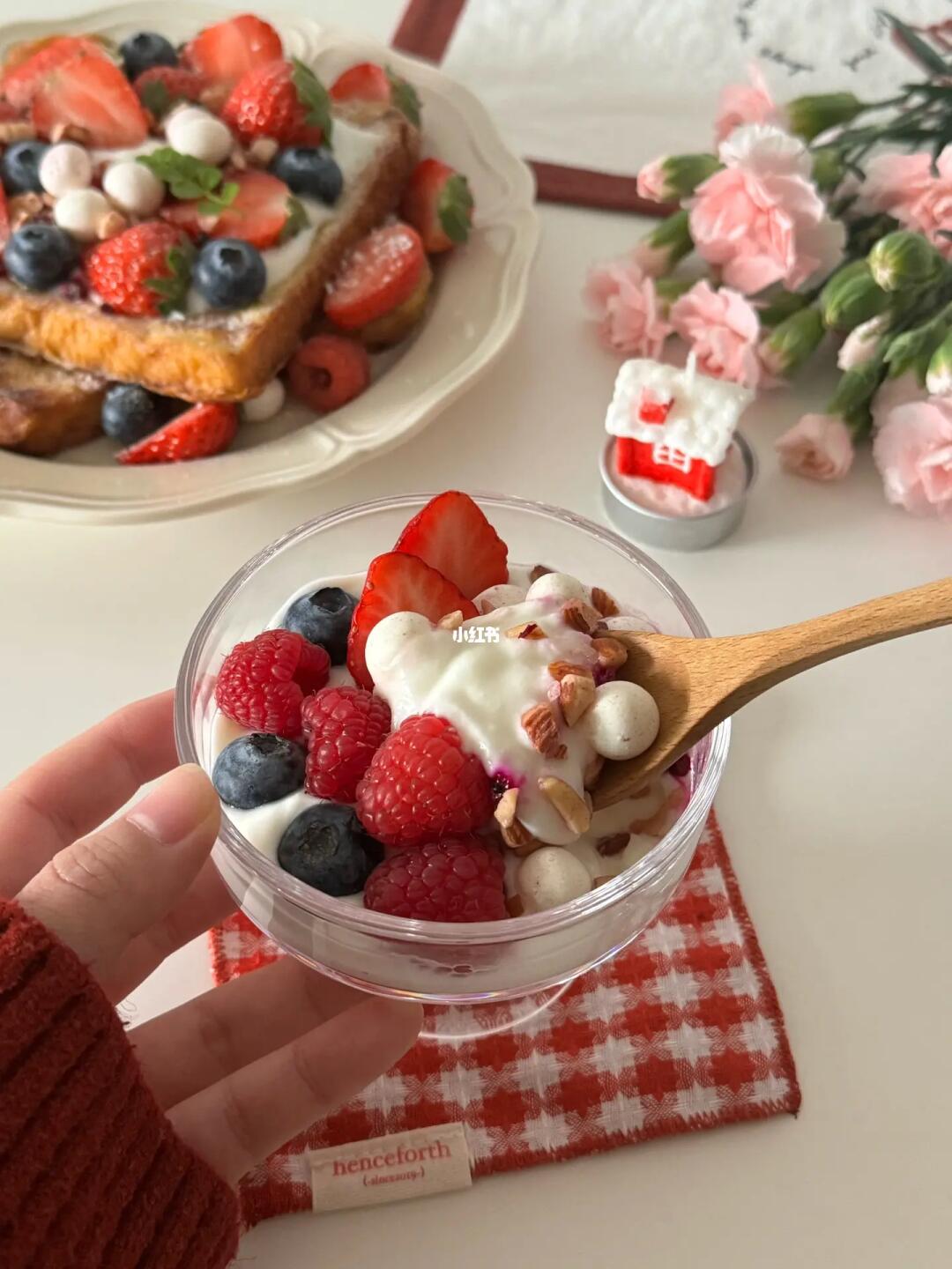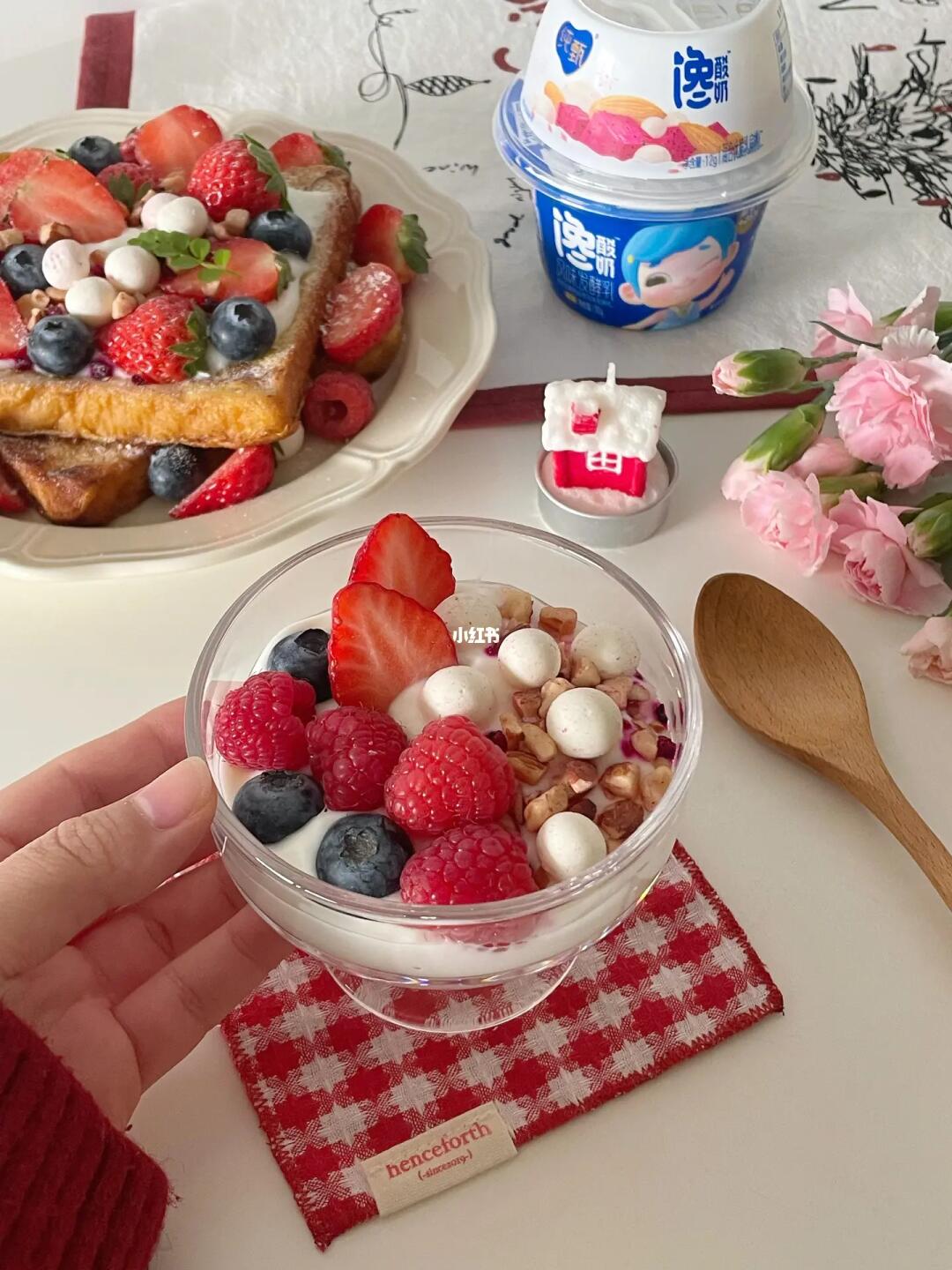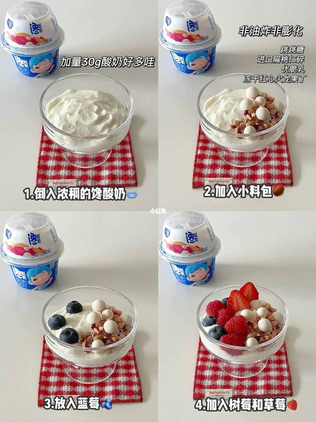 再用馋酸奶DIY一个快手酸奶杯吧🍓倒入酸奶后再加入自带的超丰富小料包放入水果装饰即可。
