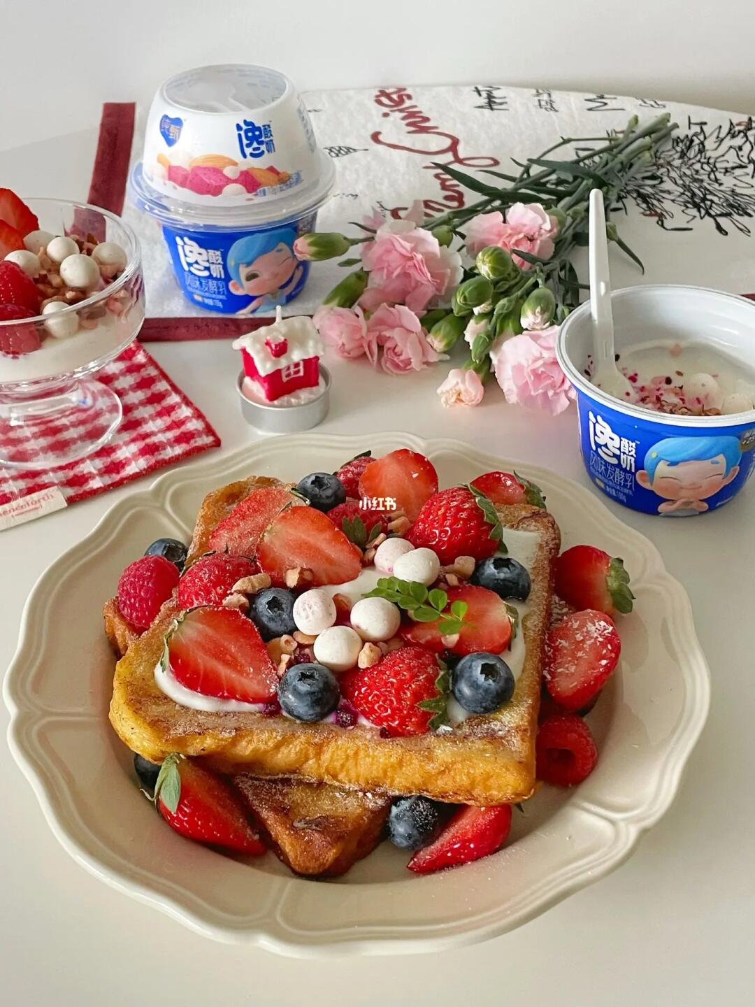 3️⃣吐司放盘中,淋上纯甄馋酸奶,撒小料包。