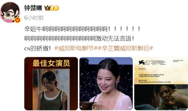 辛芷蕾为人也很坦率,拿奖后接受采访,她的状态也十分松弛,被问在威尼斯拿奖代表了什么,她直言代表我很厉害呀,丝毫不掩饰自己的激动心情,还笑称自己这次实至名归,意料之外情理之中。