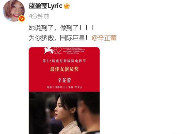 第82届威尼斯国际电影节上,中国女演员辛芷蕾凭借电影《日掛中天》荣获最佳女演员奖,成为继巩俐,叶德娴之后,第三位获此殊荣的华语女演员,热搜榜上全都在报道她的好消息。