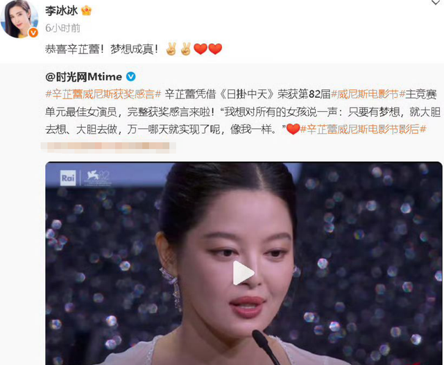 圈内好友也纷纷发文祝贺辛芷蕾,李冰冰祝她梦想成真。